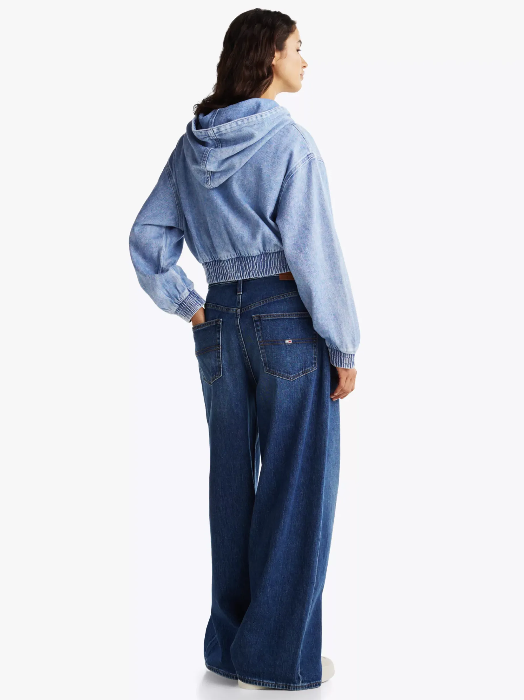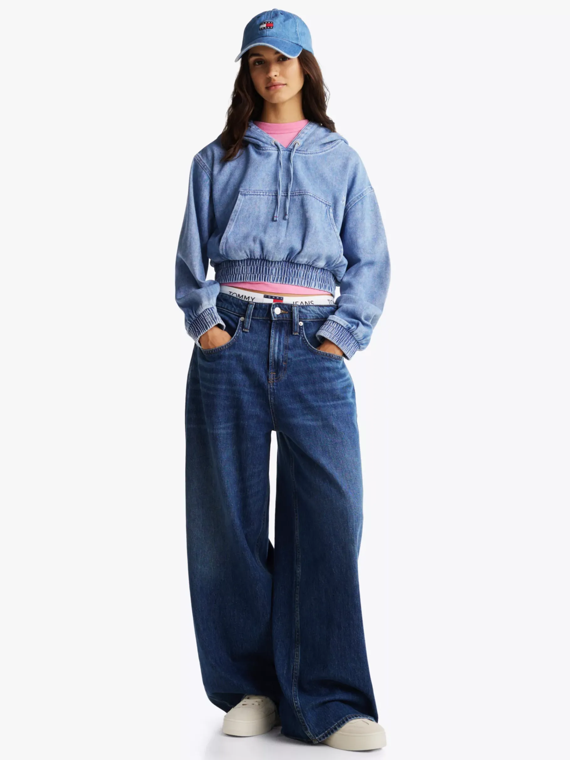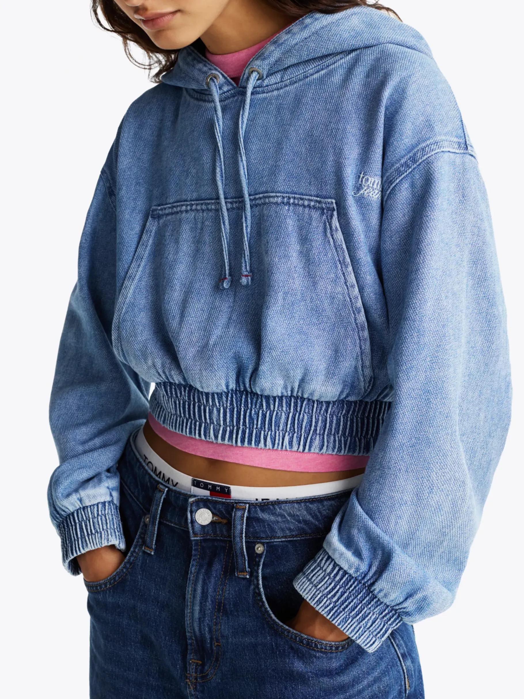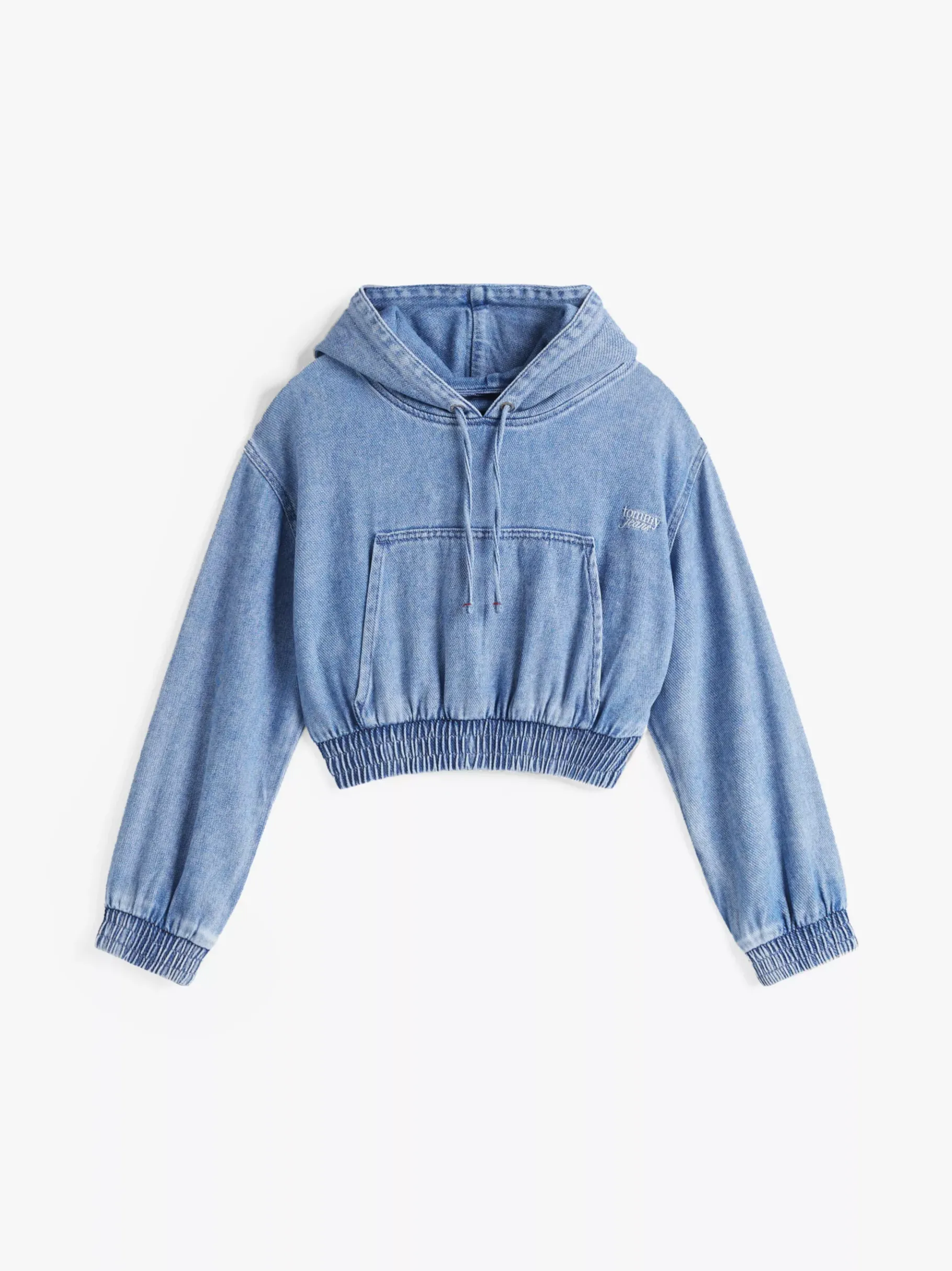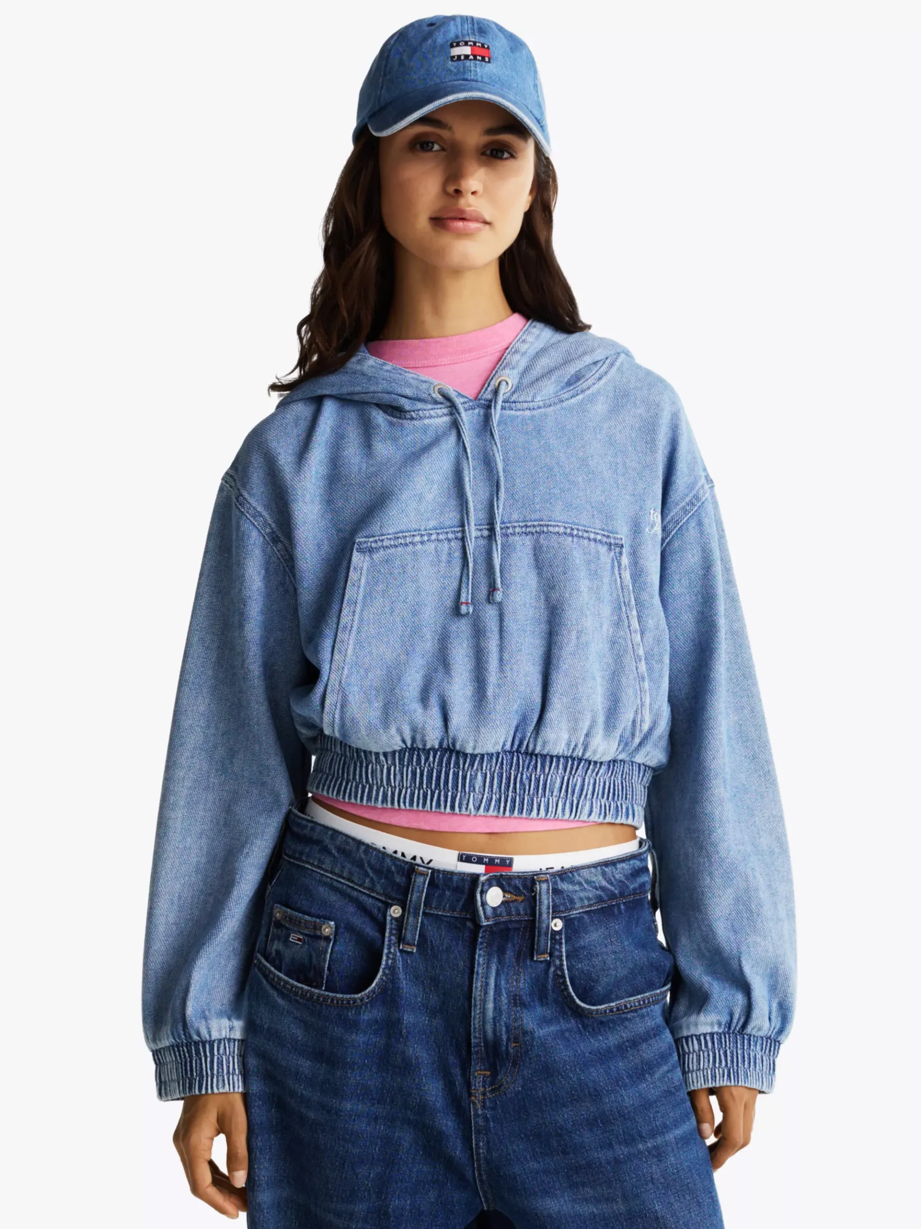 Streetwear-Vibes für einen Klassiker: Dieser relaxte Jeans-Hoodie punktet mit einer großen Kapuze und überschnittenen Schultern.