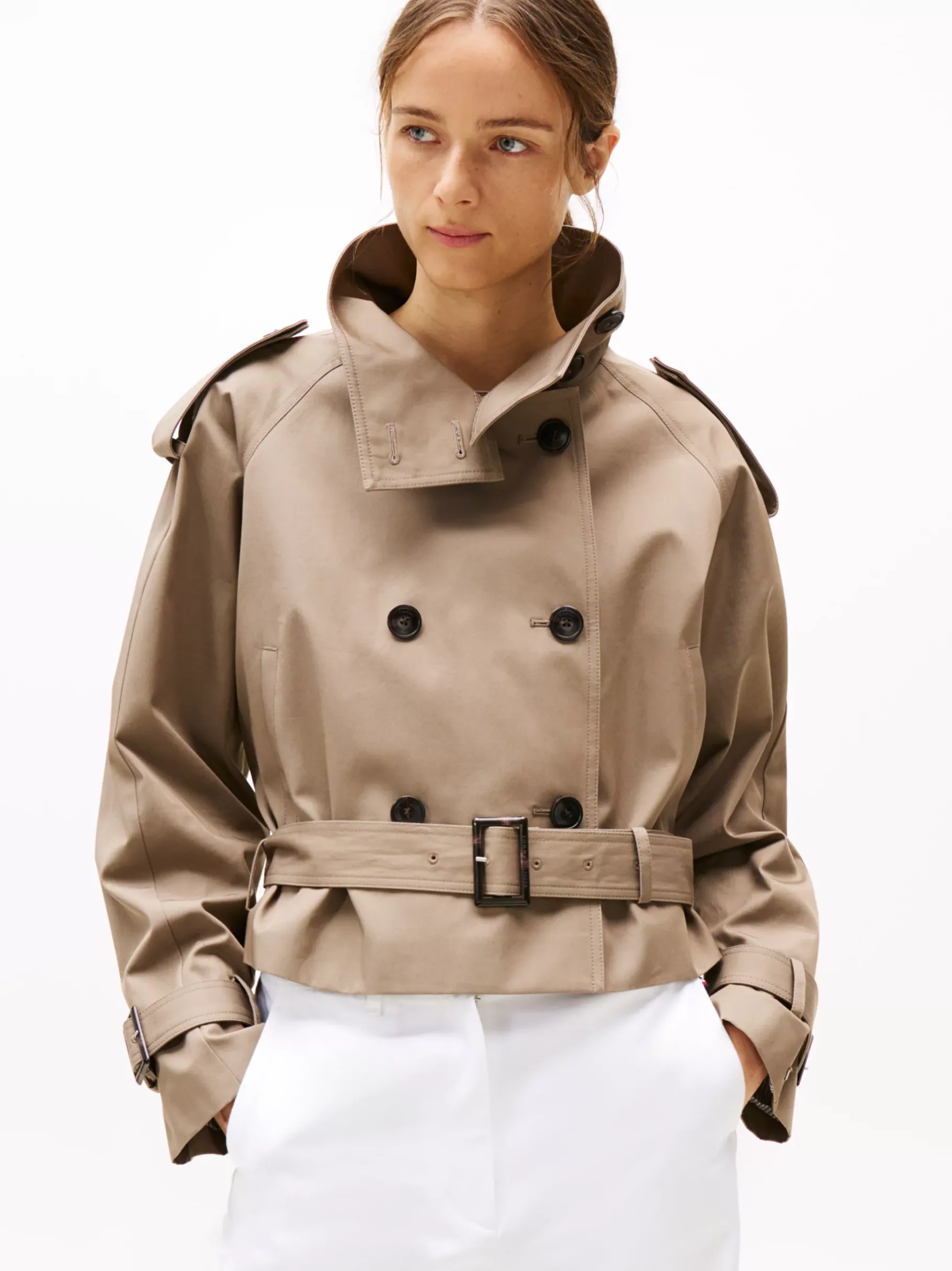 Setz bei wechselhaftem Wetter auf diesen wasserabweisenden Trenchcoat in Cropped Fit mit zeitlosen Details wie Schulterriegel.