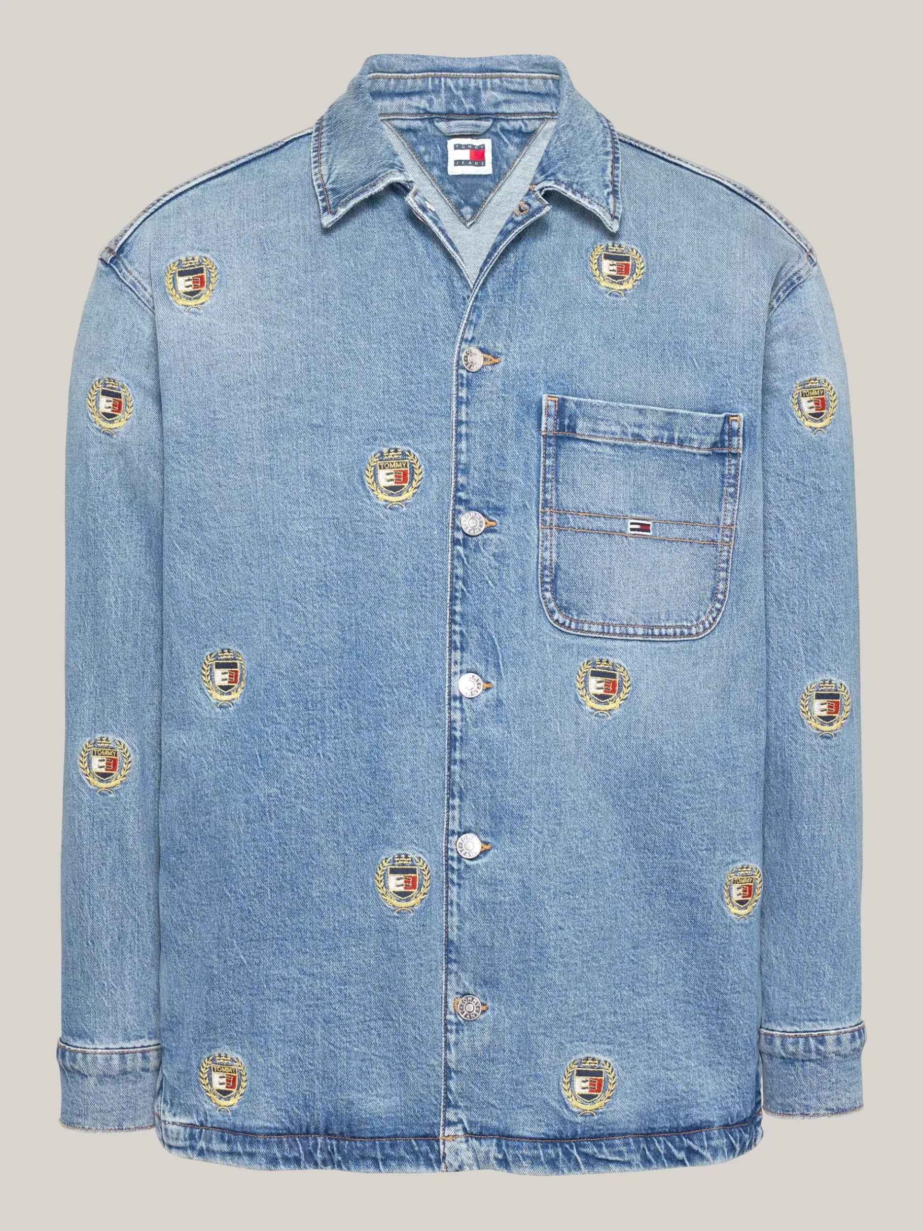 Verpass deinen Smart-Casual-Outfits ein Upgrade in Form dieses vielseitigen Denim-Overshirts mit Wappen-Stickereien und praktischer Brusttasche.