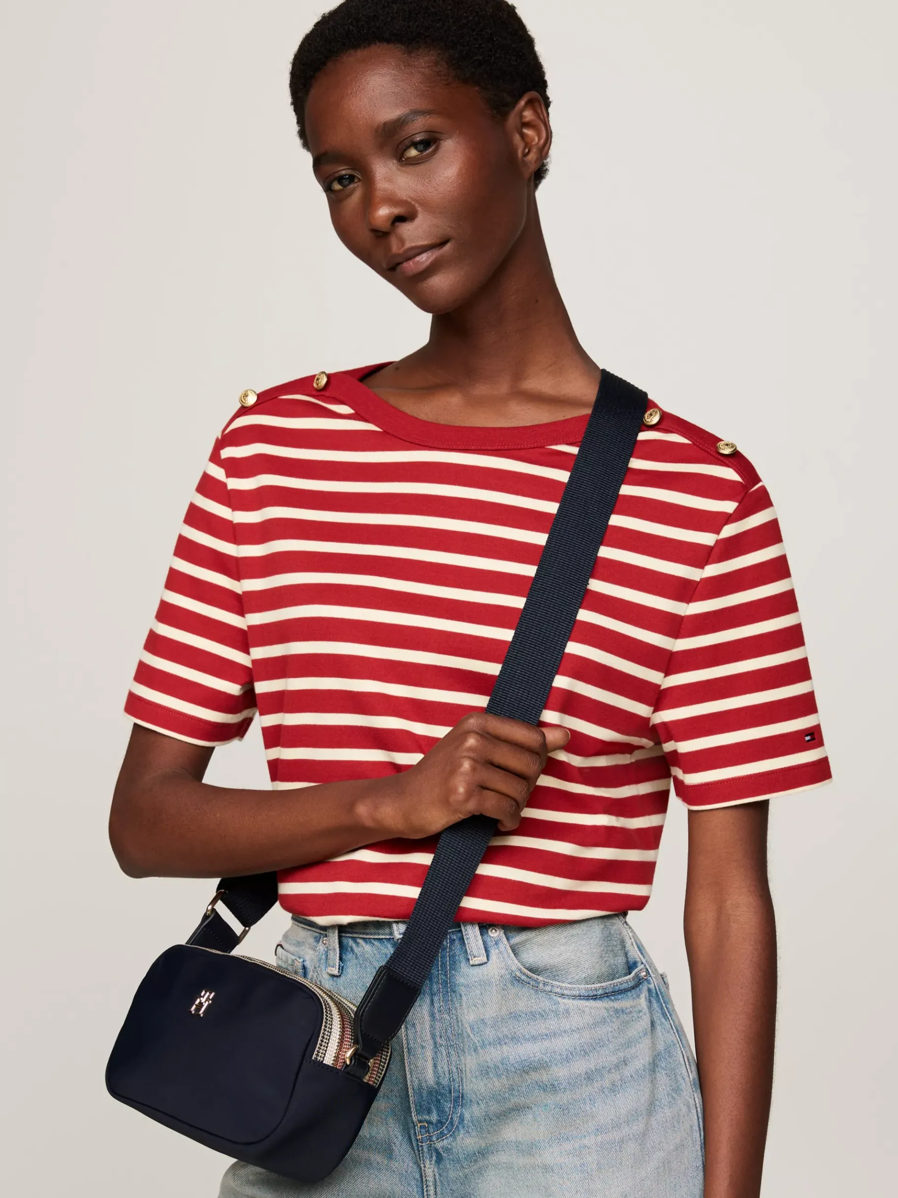 Ein auffälliges Tommy-Detail und zwei praktische Reißverschlussfächer: Diese Kameratasche vereint Stil und Funktion.