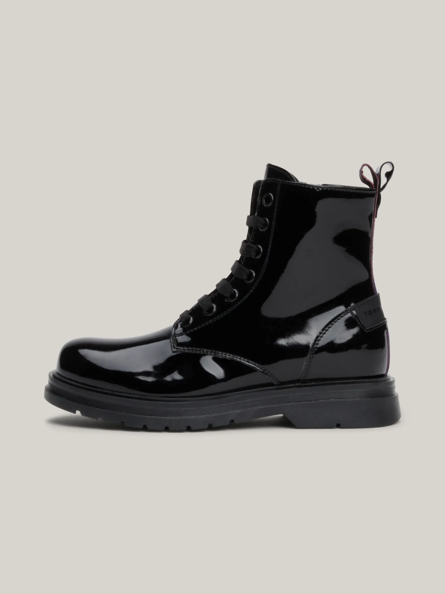 Ein glänzendes Lack-Finish verleiht dieser flachen Lace-up Stiefelette luxuriöse Vibes.