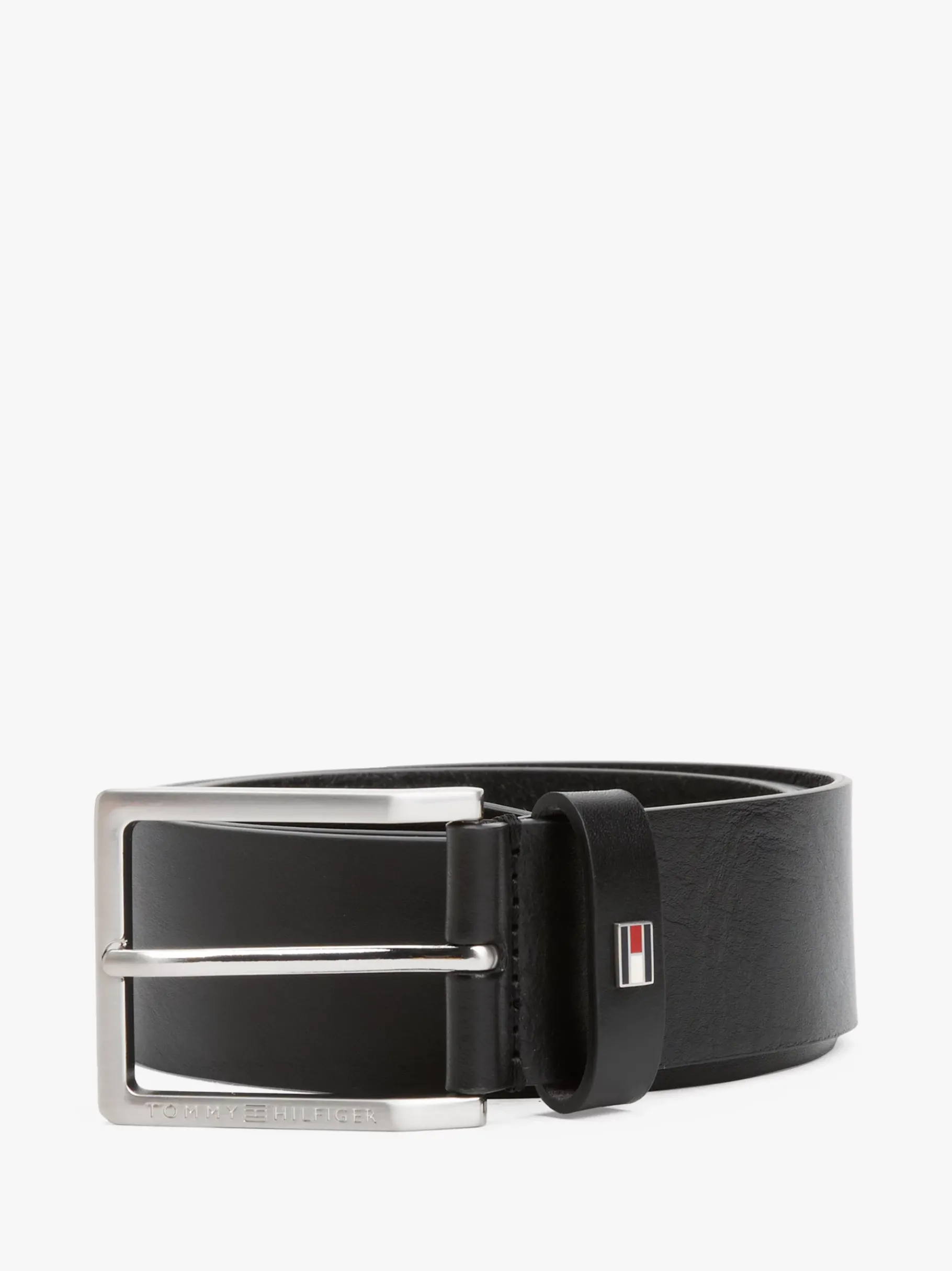 Dieser schlichte Gürtel aus strukturiertem Leder hat eine dezente Tommy Hilfiger Flag aus Emaille an der Gürtelschlaufe.