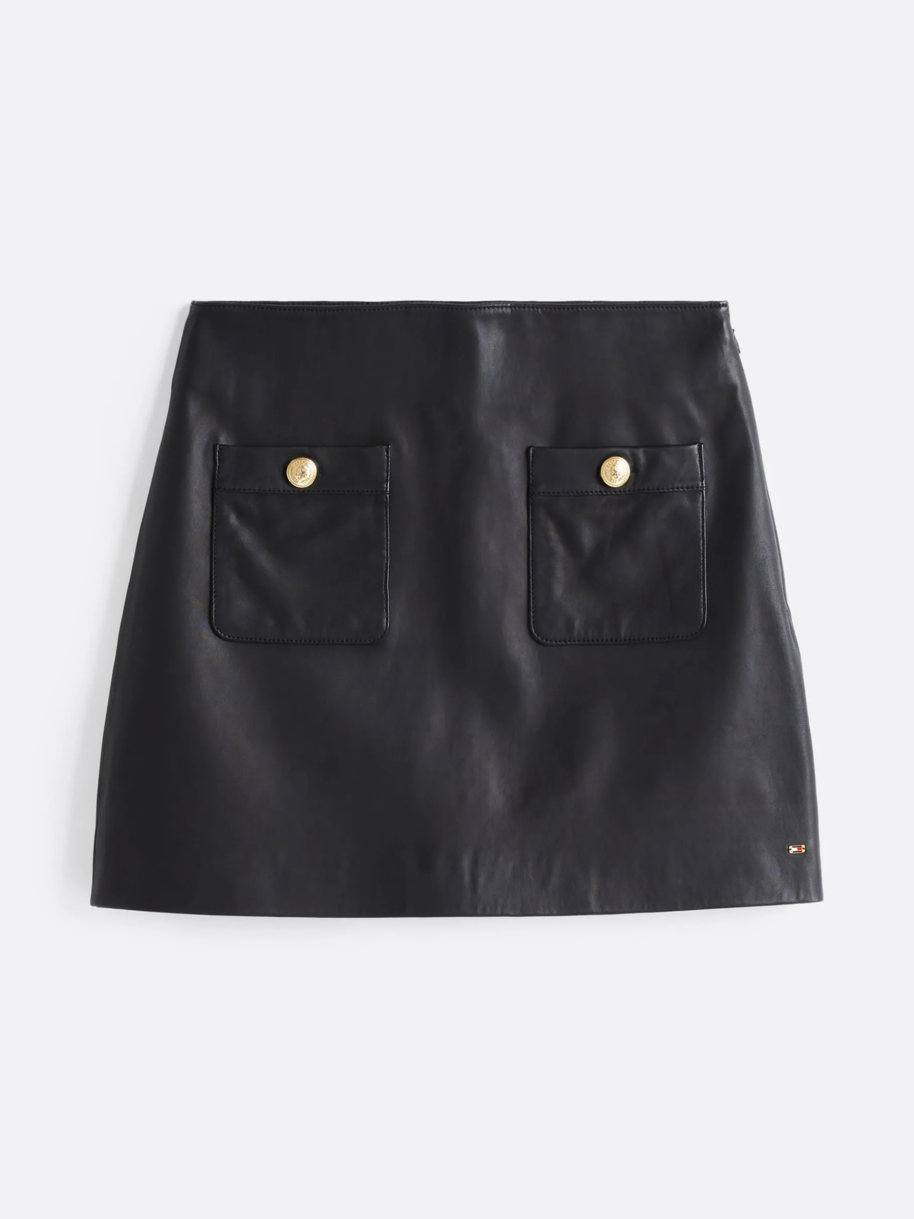 Dieser partytaugliche Minirock aus Leder begeistert mit einem eleganten Finish in Form von vorne aufgesetzten Taschen mit goldfarbenen Knöpfen.