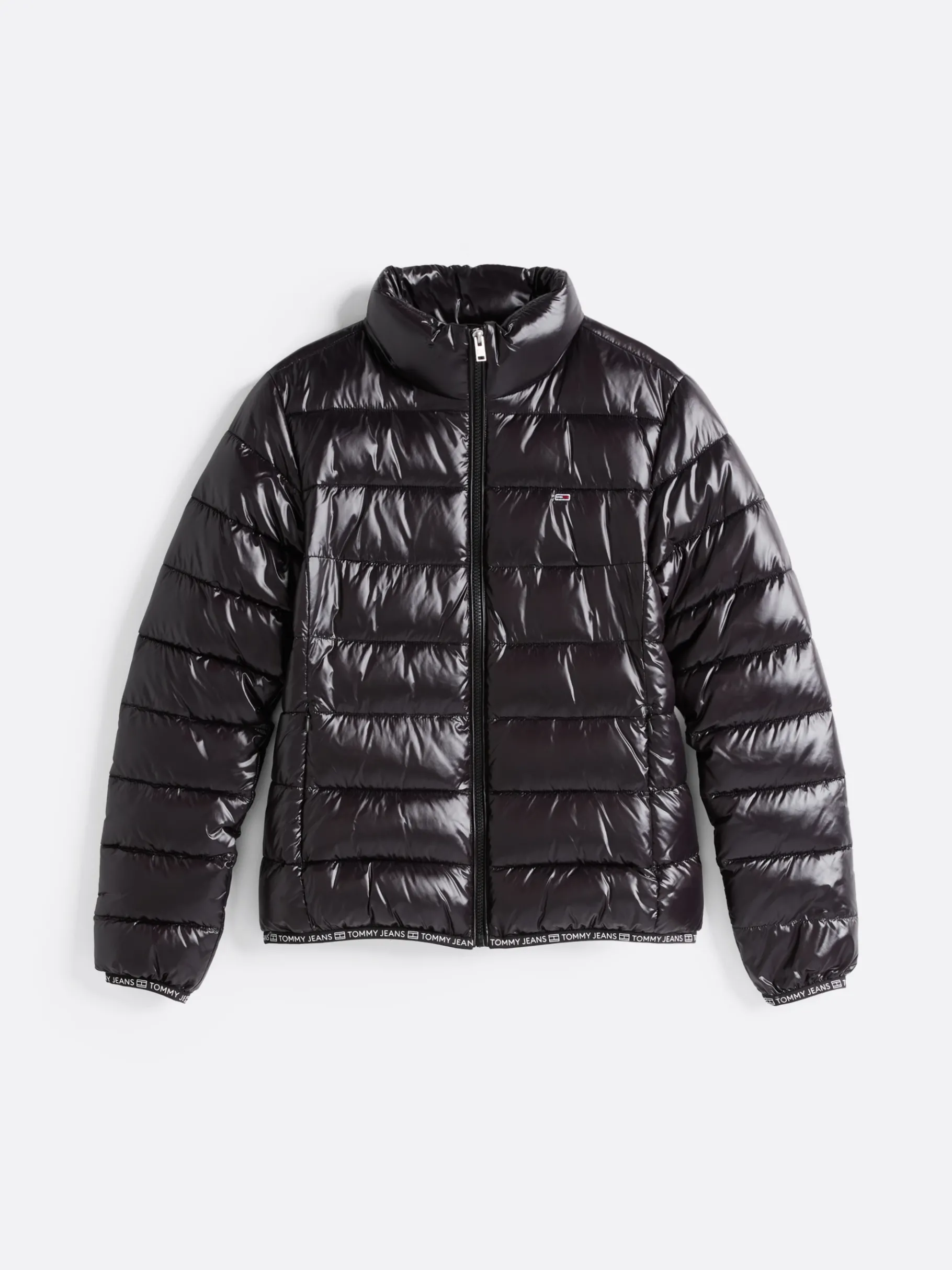 Verströme 90s-Vibes in dieser Puffer-Jacke mit Hochglanz-Finish und Tommy Jeans-Logomuster-Tape an Saum und Bündchen.