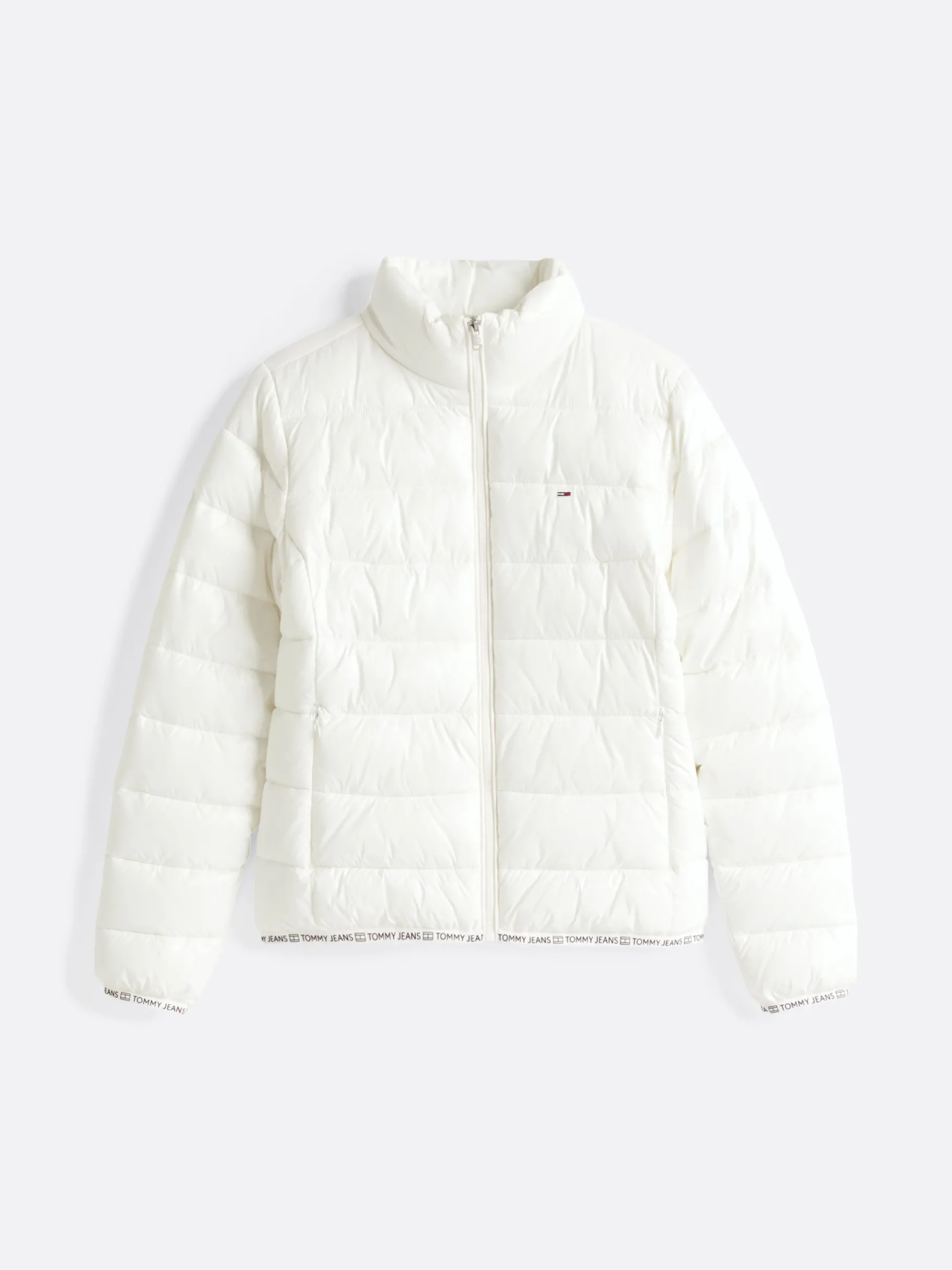 Verströme 90s-Vibes in dieser Puffer-Jacke mit Hochglanz-Finish und Tommy Jeans-Logomuster-Tape an Saum und Bündchen.