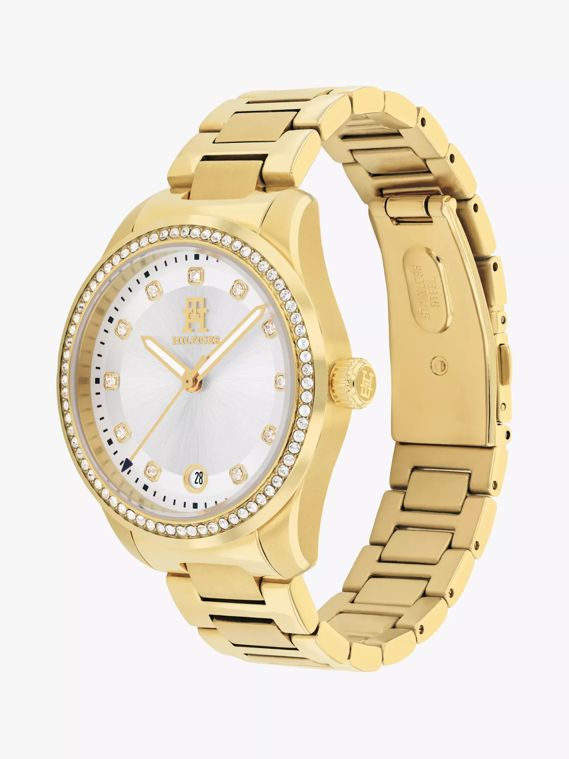 Diese vergoldete, wasserdichte Edelstahl-Uhr ist mit Kristallen und eleganten Metall-Highlights verziert.