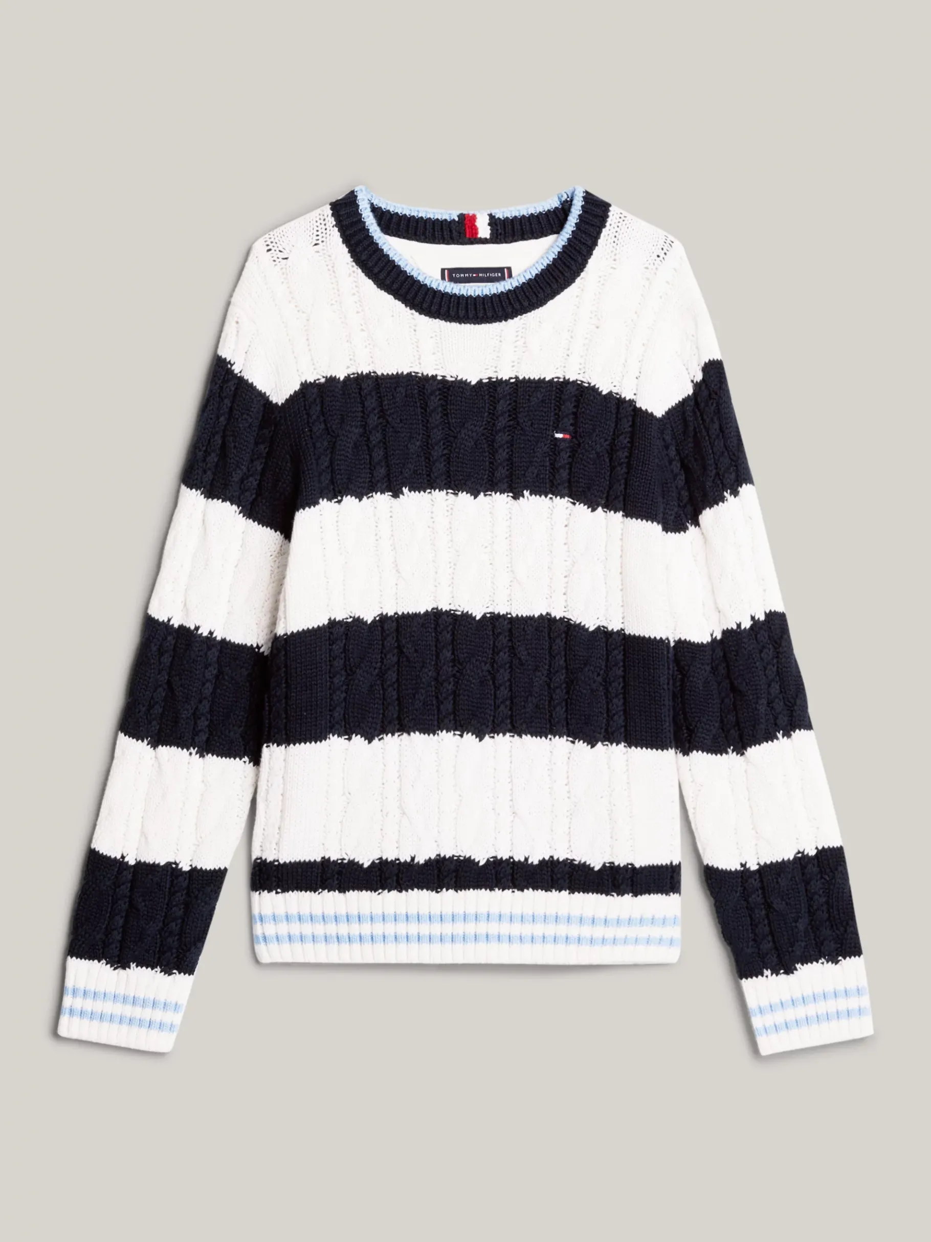 Dieser Zopfstrick-Pullover aus Baumwollmix mit auffälligen Querstreifen im Color Block-Design interpretiert einen zeitlosen Klassiker neu.
