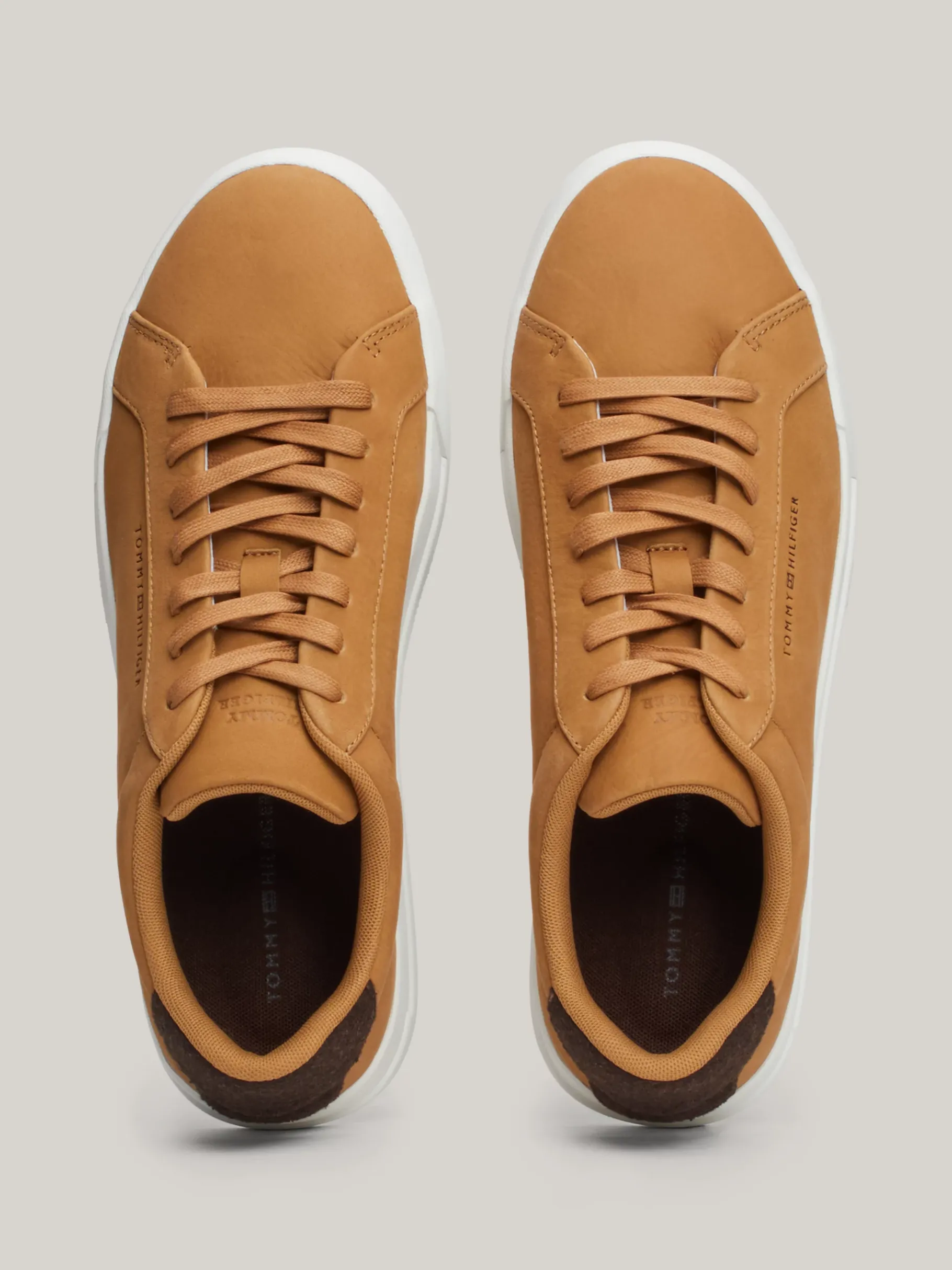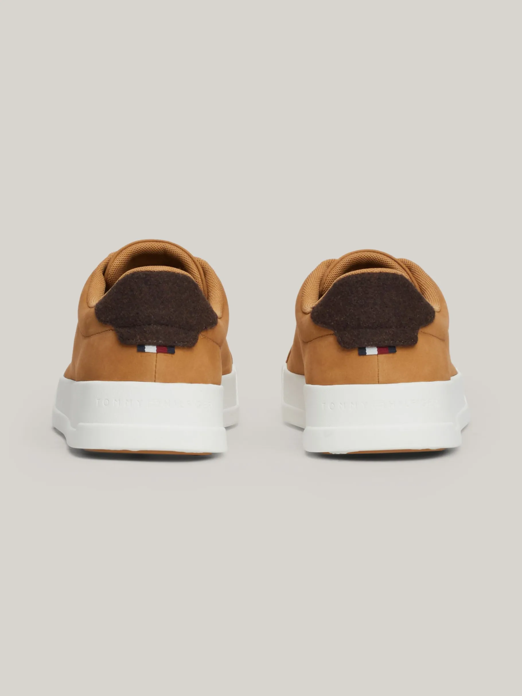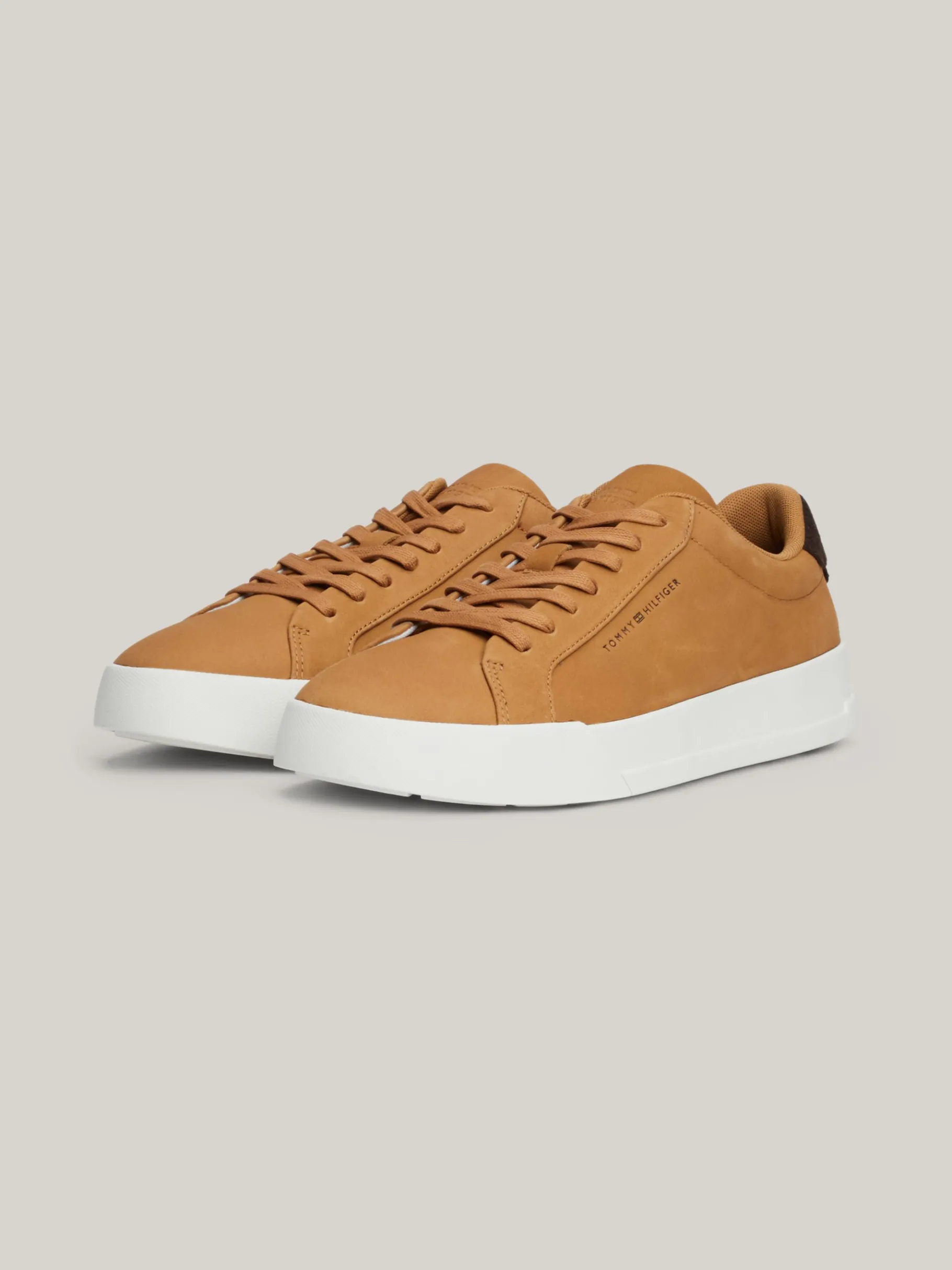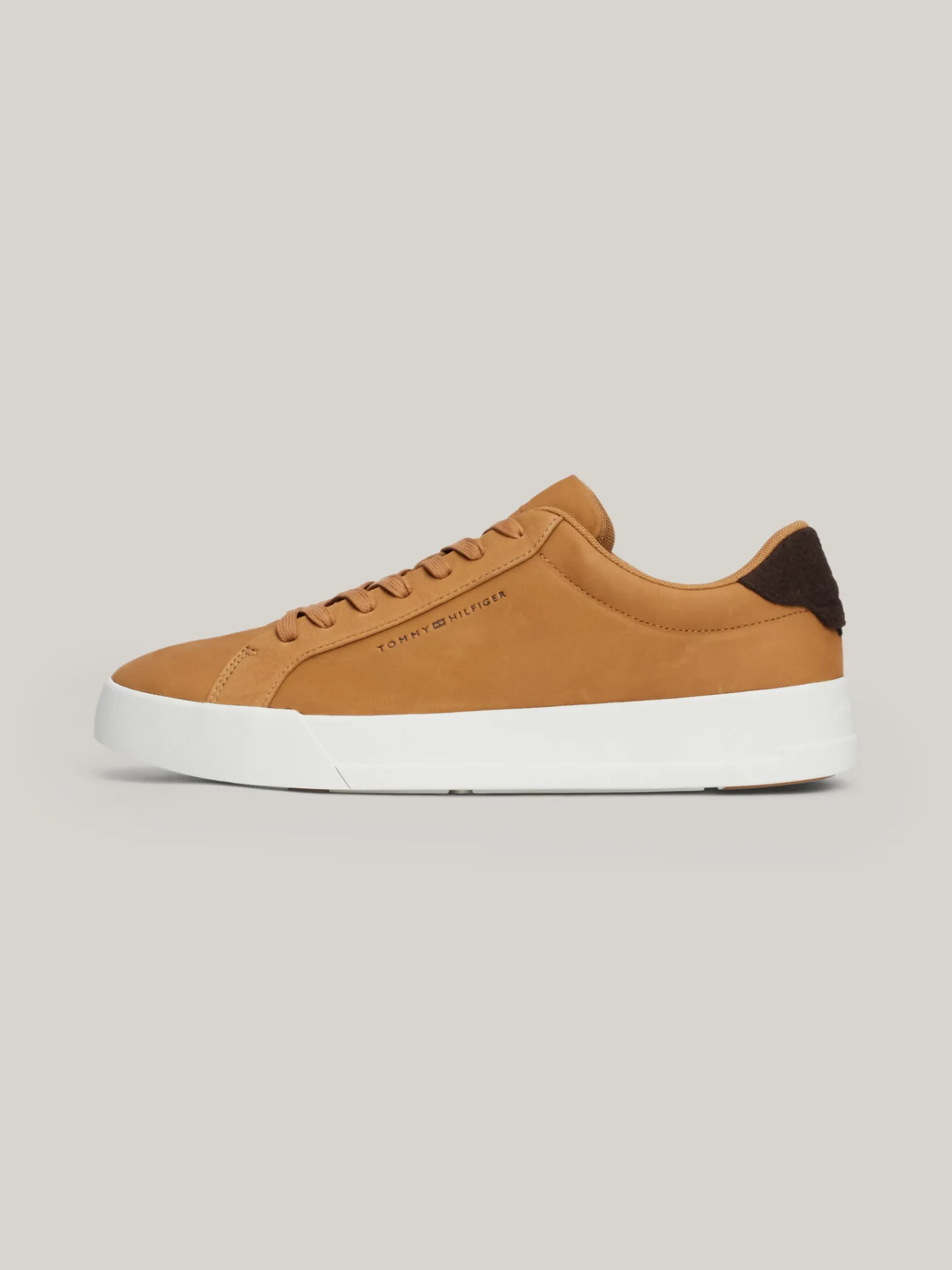 Dieser Court-Sneaker aus Nubukleder punktet mit einer dicken Sohle und einem dynamischen Kontrast-Einsatz an der Ferse.