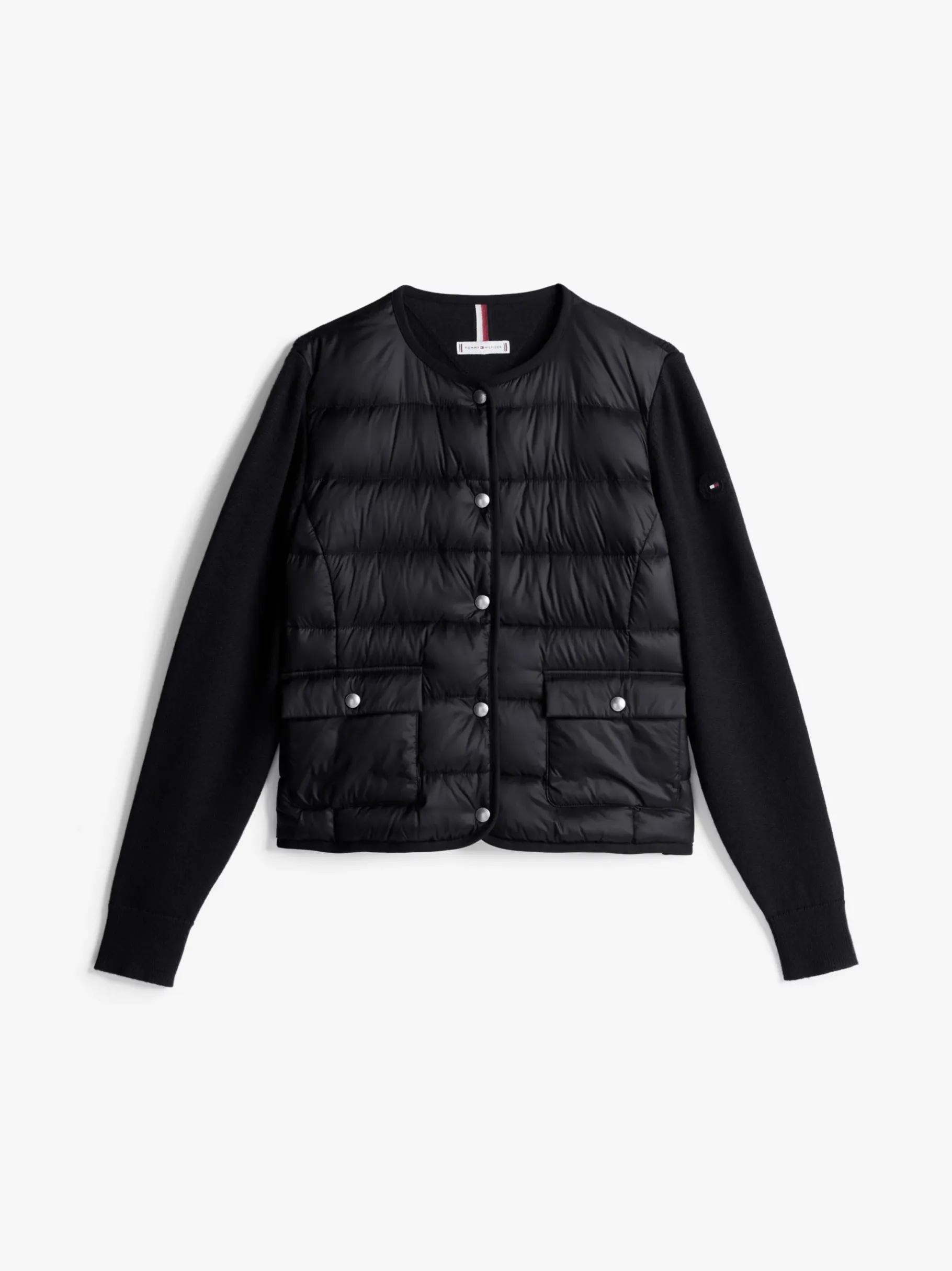 Die gestrickten Ärmel und Rückseite setzen bei dieser Jacke einen Style-Kontrast zum Steppmuster mit Daunenfüllung auf der Vorderseite.