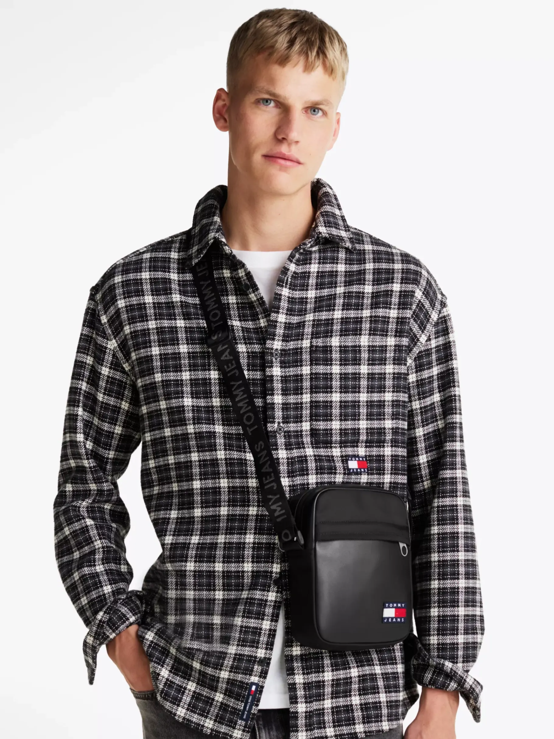 Verstaue deine Wertsachen in dieser kompakten Reportertasche mit leuchtend buntem Tommy-Badge.