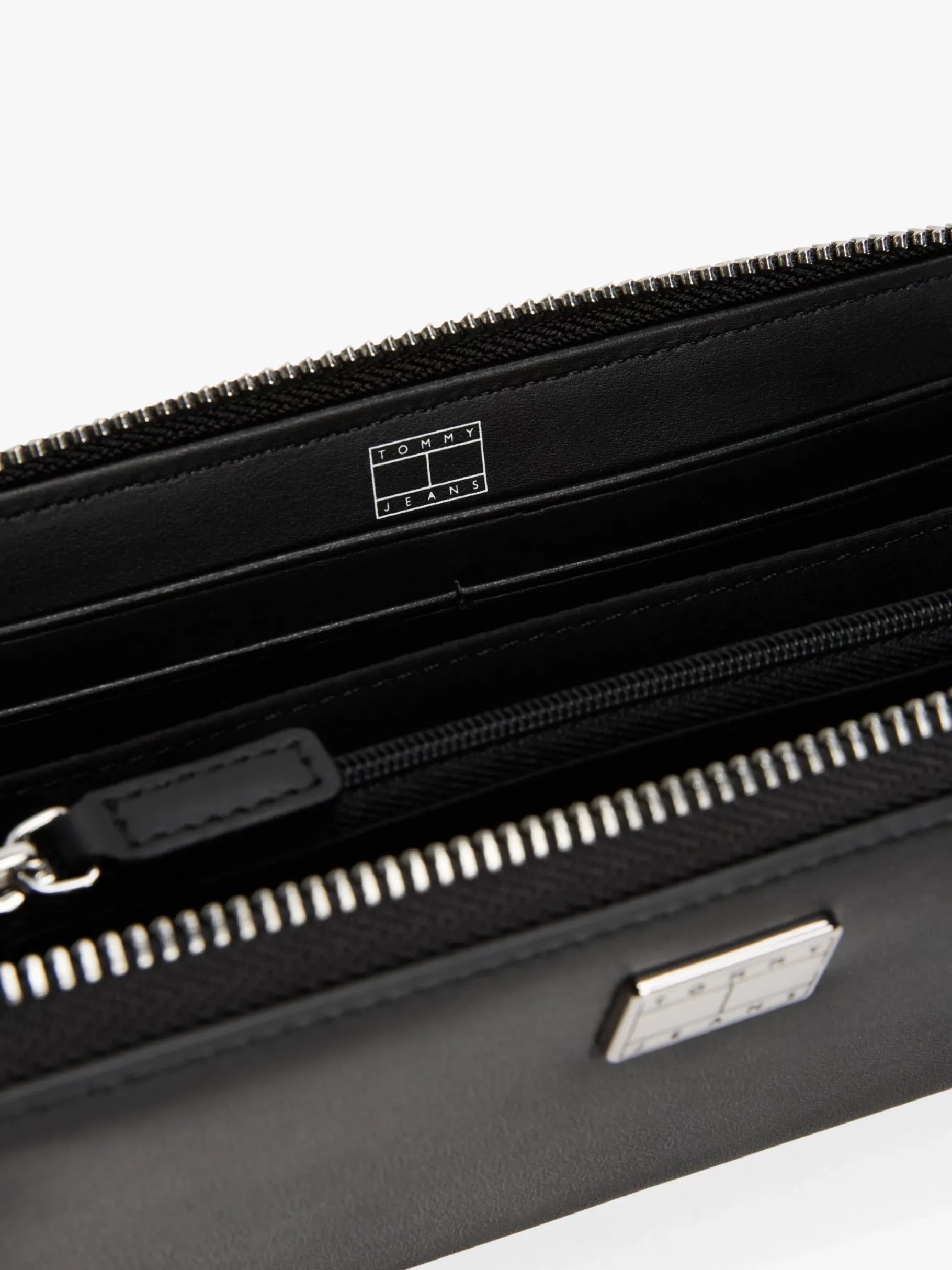 Das glänzende Logo auf der Vorderseite dieser Geldbörse aus Glattleder setzt einen schicken Akzent.