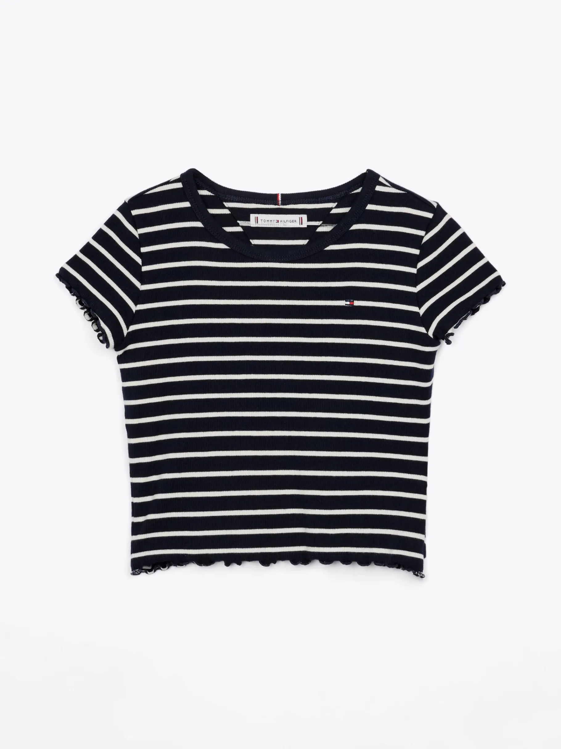 Dieses T-Shirt aus Stretch-Baumwolle mit Querstreifen und Rüschen an den Säumen lässt sich zu vielseitigen Looks kombinieren.