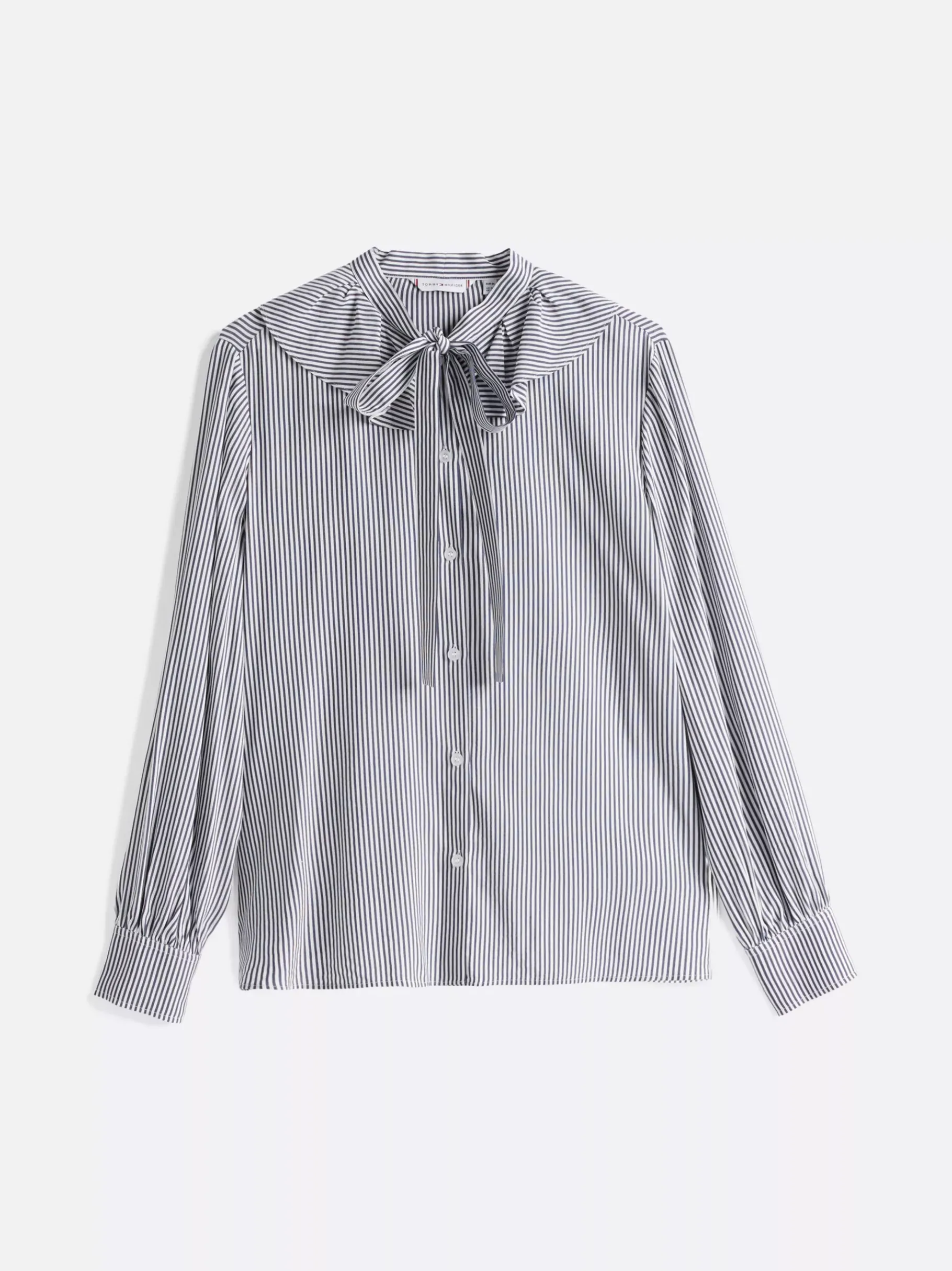 Bei dieser Bluse mit femininem Rüschen-Detail und Bindeband am Ausschnitt erinnert das Ithaka-Streifen-Design an smarte Office-Looks.