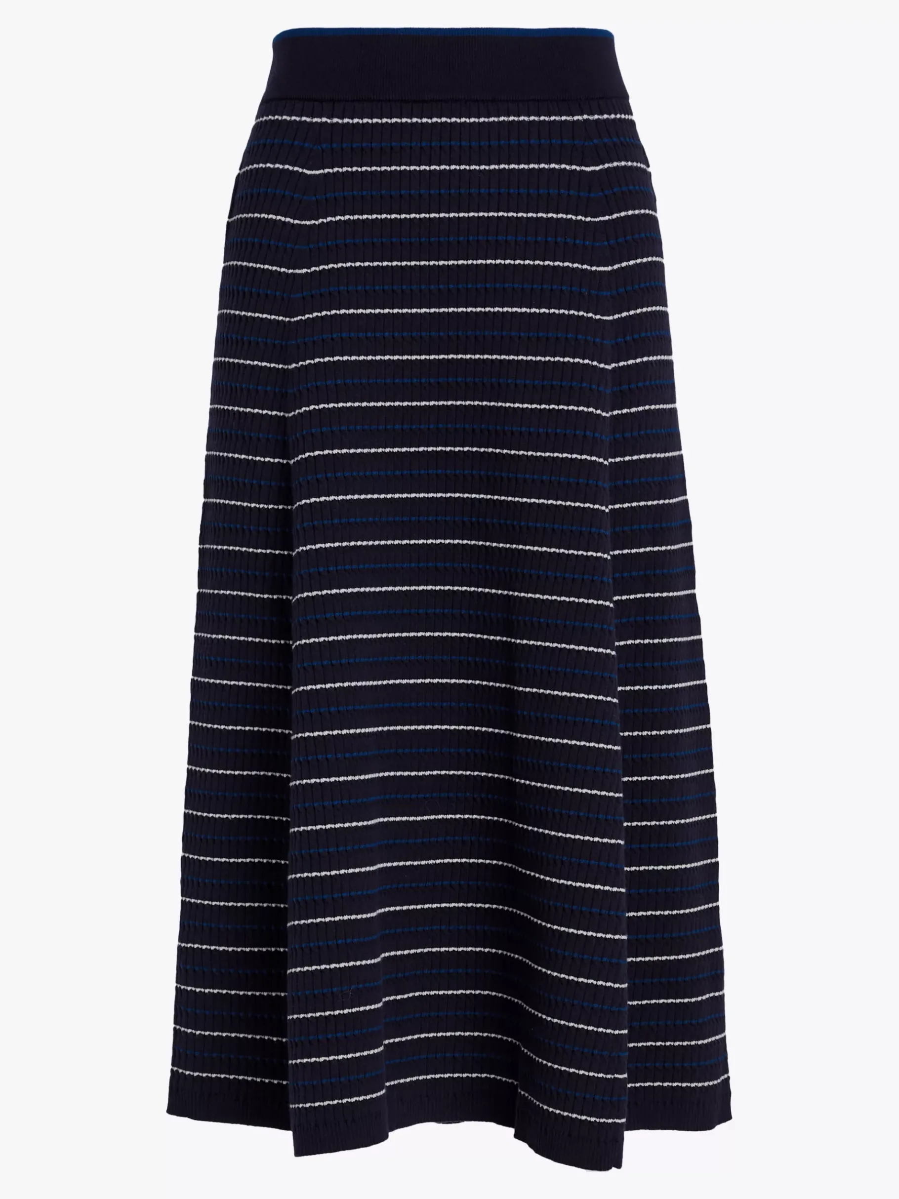 Dieser Midi-Rock ist ideal für Büro und Wochenenden und ein gestreiftes Mini-Zopfstrickmuster setzt smarte Farbakzente.