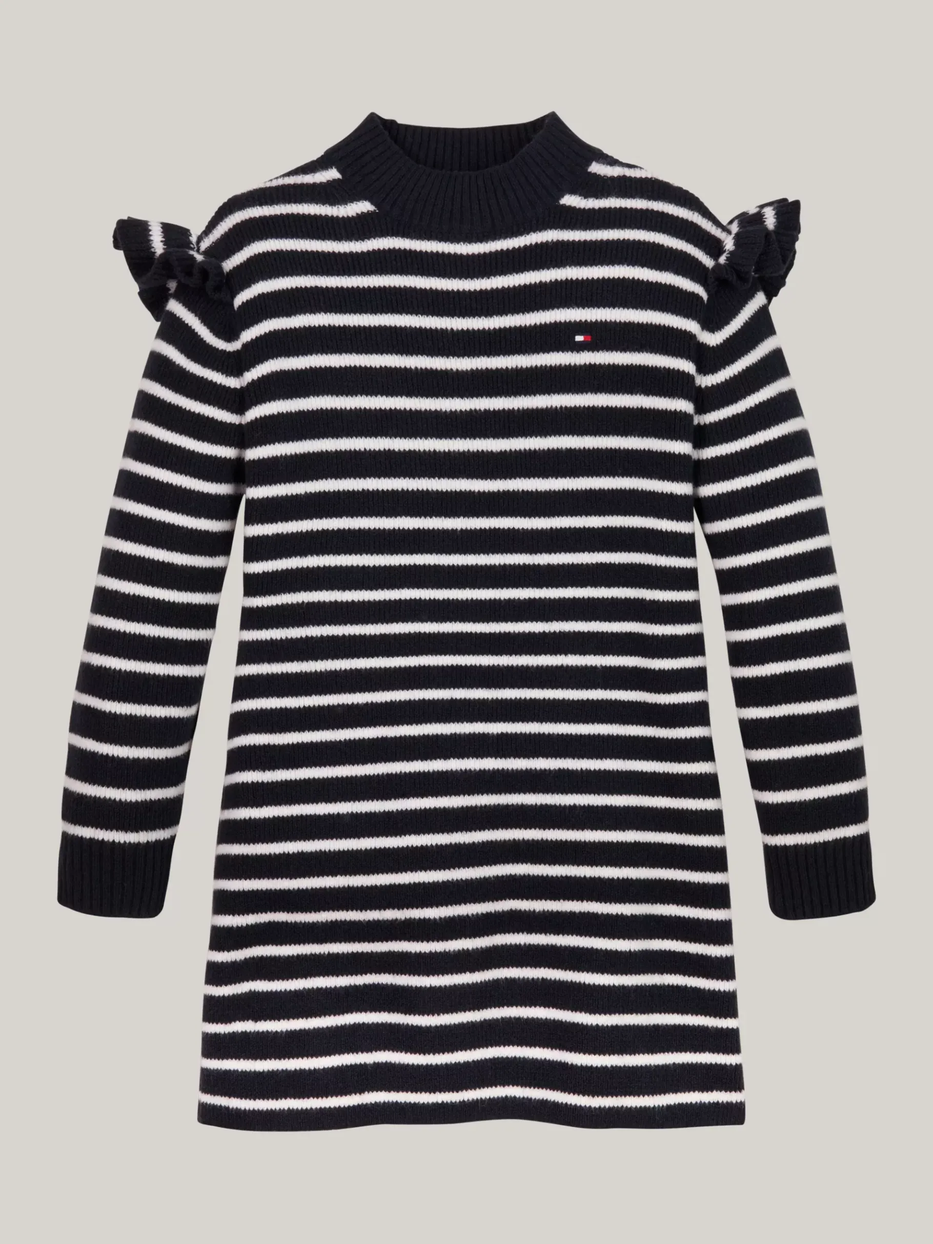 Dieses bequeme Strickkleid mit Breton-Streifen und Rüschen-Details ist ideal für spontane Partys.
