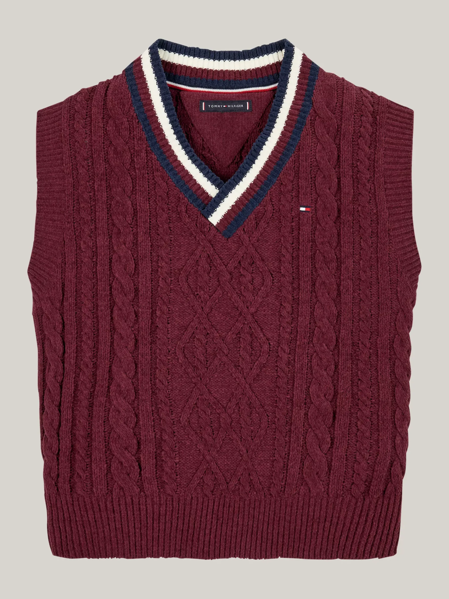 Dieser vom Kricket inspirierte Zopfstrick-Pullunder ist perfekt für Lagenlooks, und sein Global Stripe-Design am V-Ausschnitt sorgt für Tommy-Vibes.