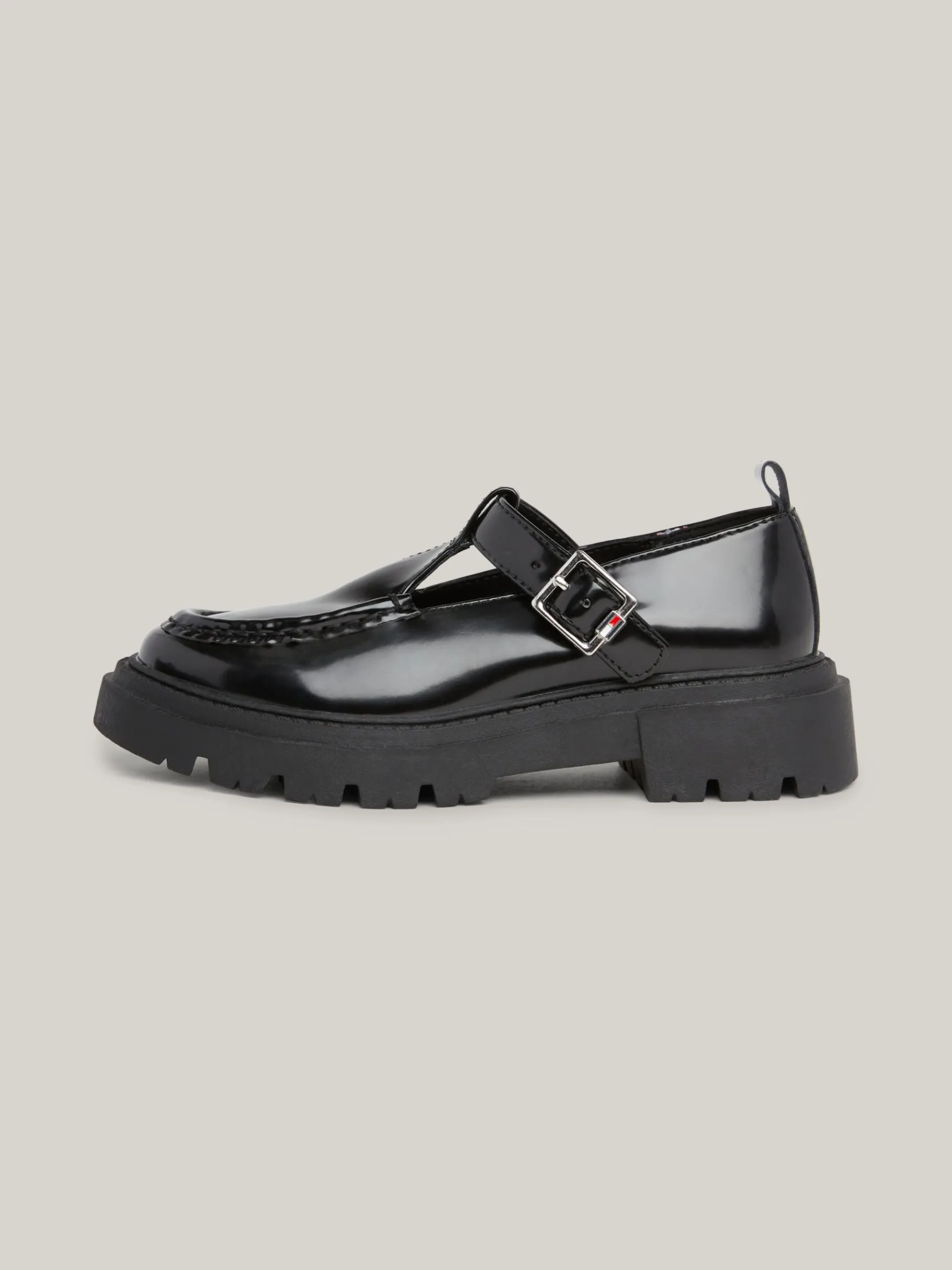 Dieser Schuh mit Lack-Finish sorgt für glänzende Auftritte, während eine hübsche Schnalle in T-Form, dezente Tommy-Details und eine klobige Sohle das Design vervollständigen.
