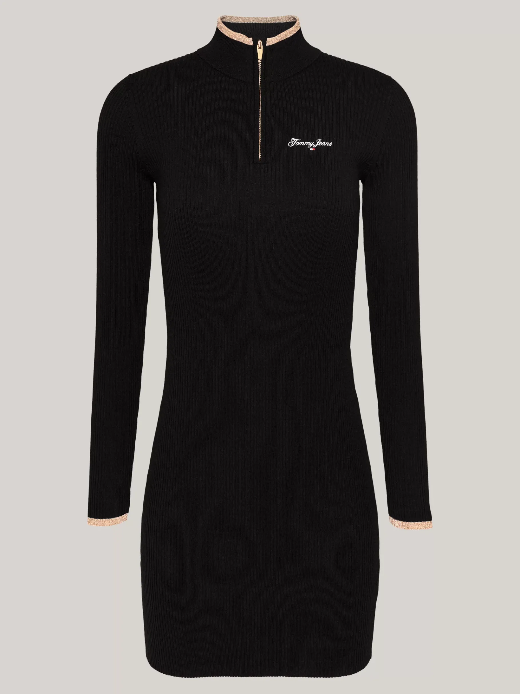 Metallic-Details bringen dieses Pulloverkleid mit auffälligen Streifen und Reißverschluss am Ausschnitt zum Funkeln.