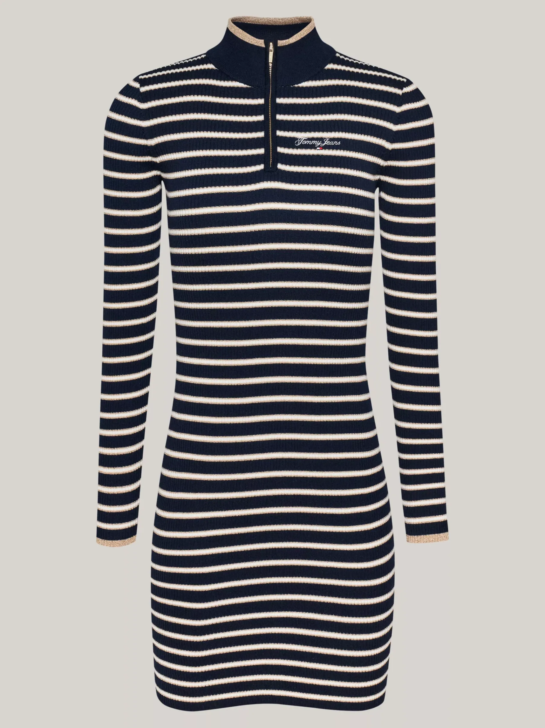 Metallic-Details bringen dieses Pulloverkleid mit auffälligen Streifen und Reißverschluss am Ausschnitt zum Funkeln.