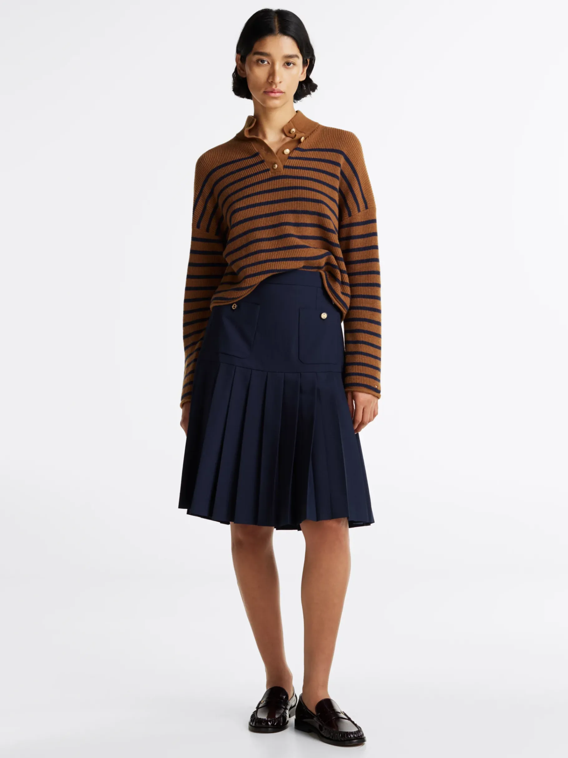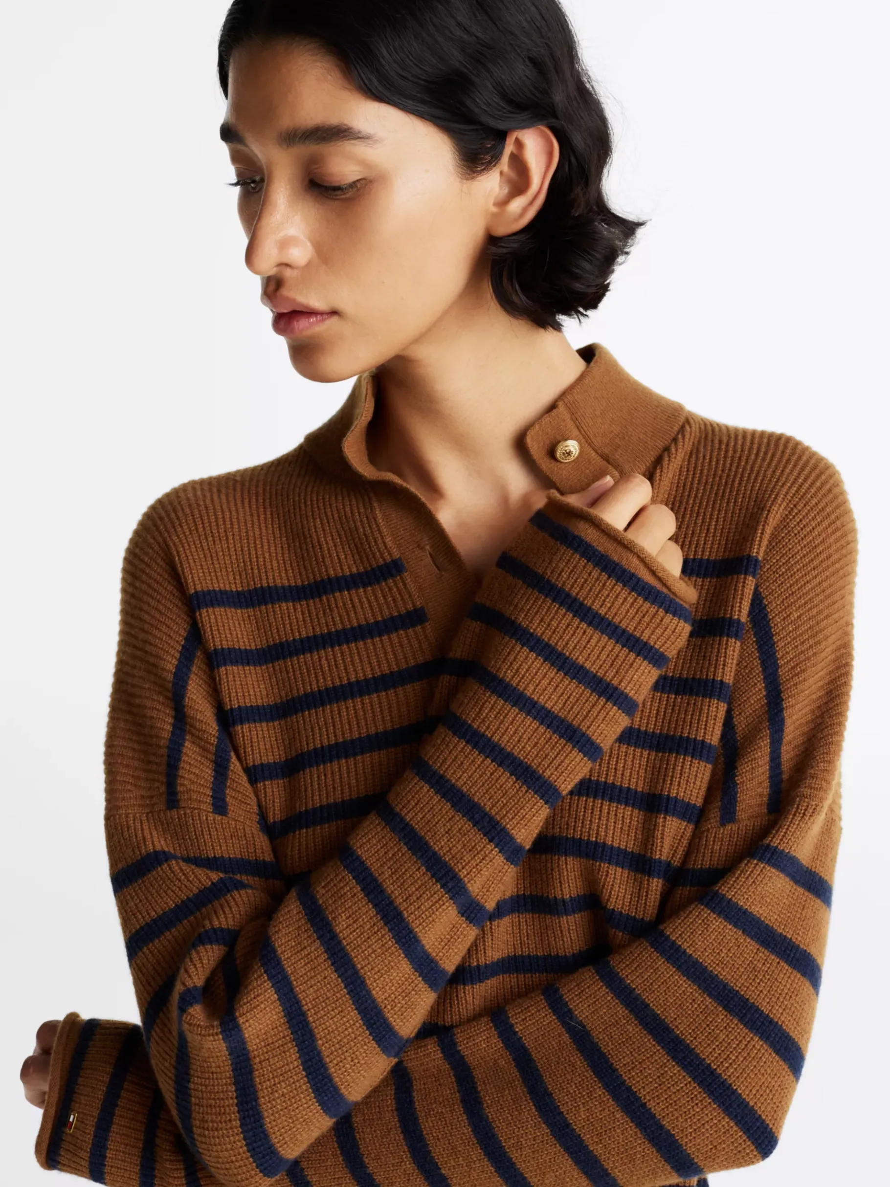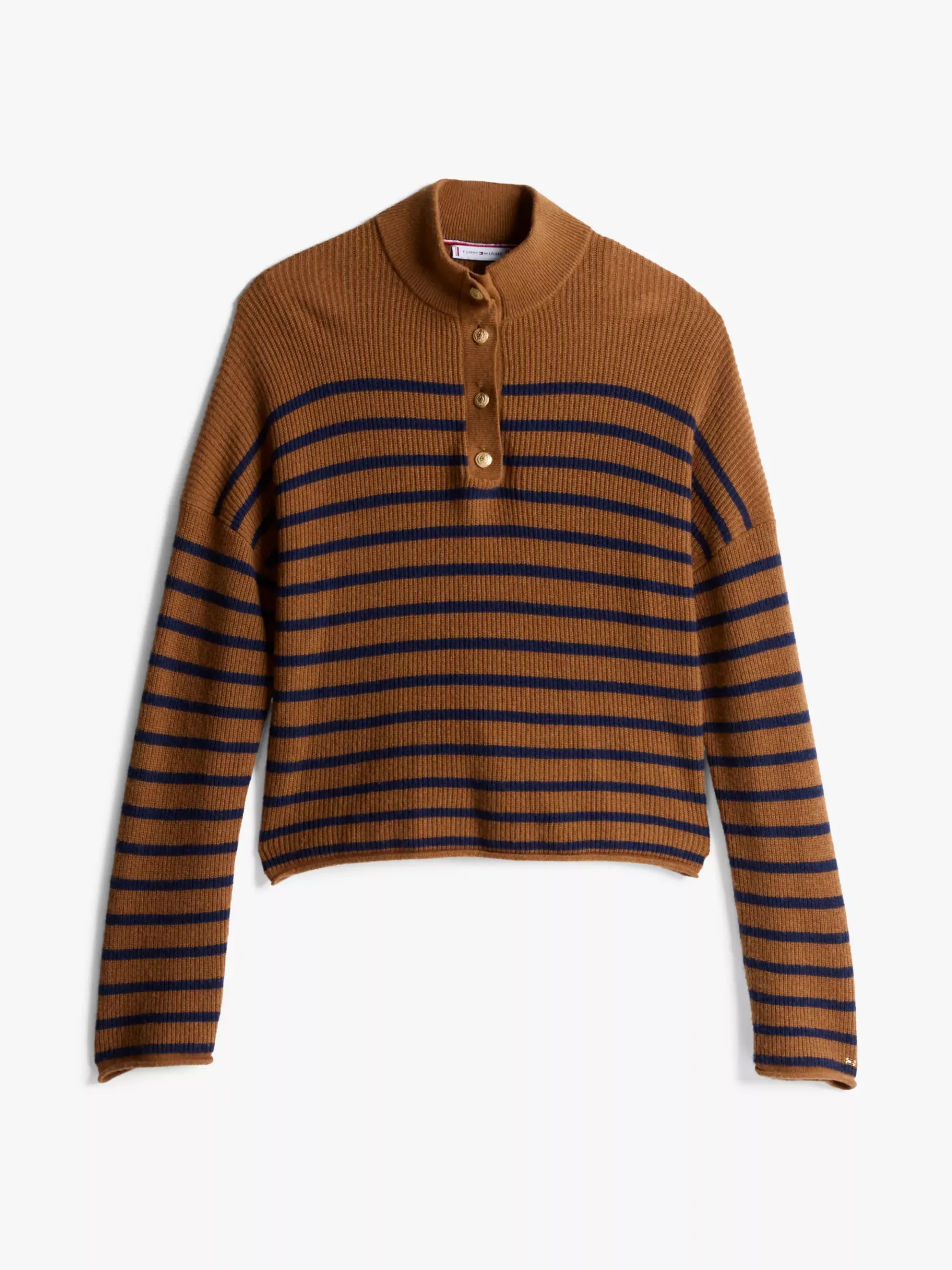 Kuschelige Vibes und eleganter Style treffen bei diesem Pullover aus Wollmix mit Polokragen und goldfarbenen Knöpfen zusammen.