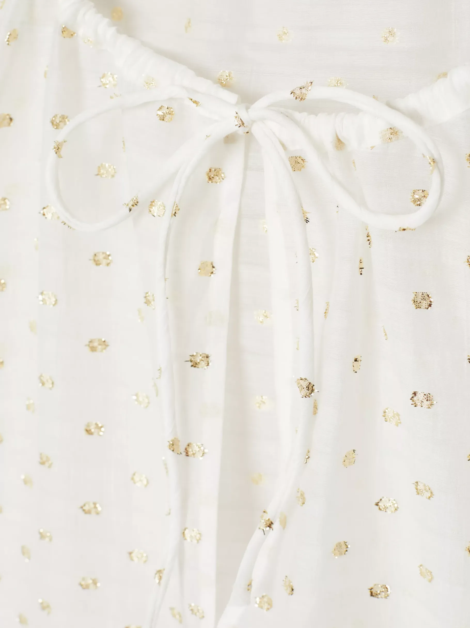 Genieße Cocktails bei Sonnenuntergang in dieser eleganten Bluse mit kleinen, schimmernden Stickereien, gerafftem Kragen und femininen Bindebändern am Ausschnitt.