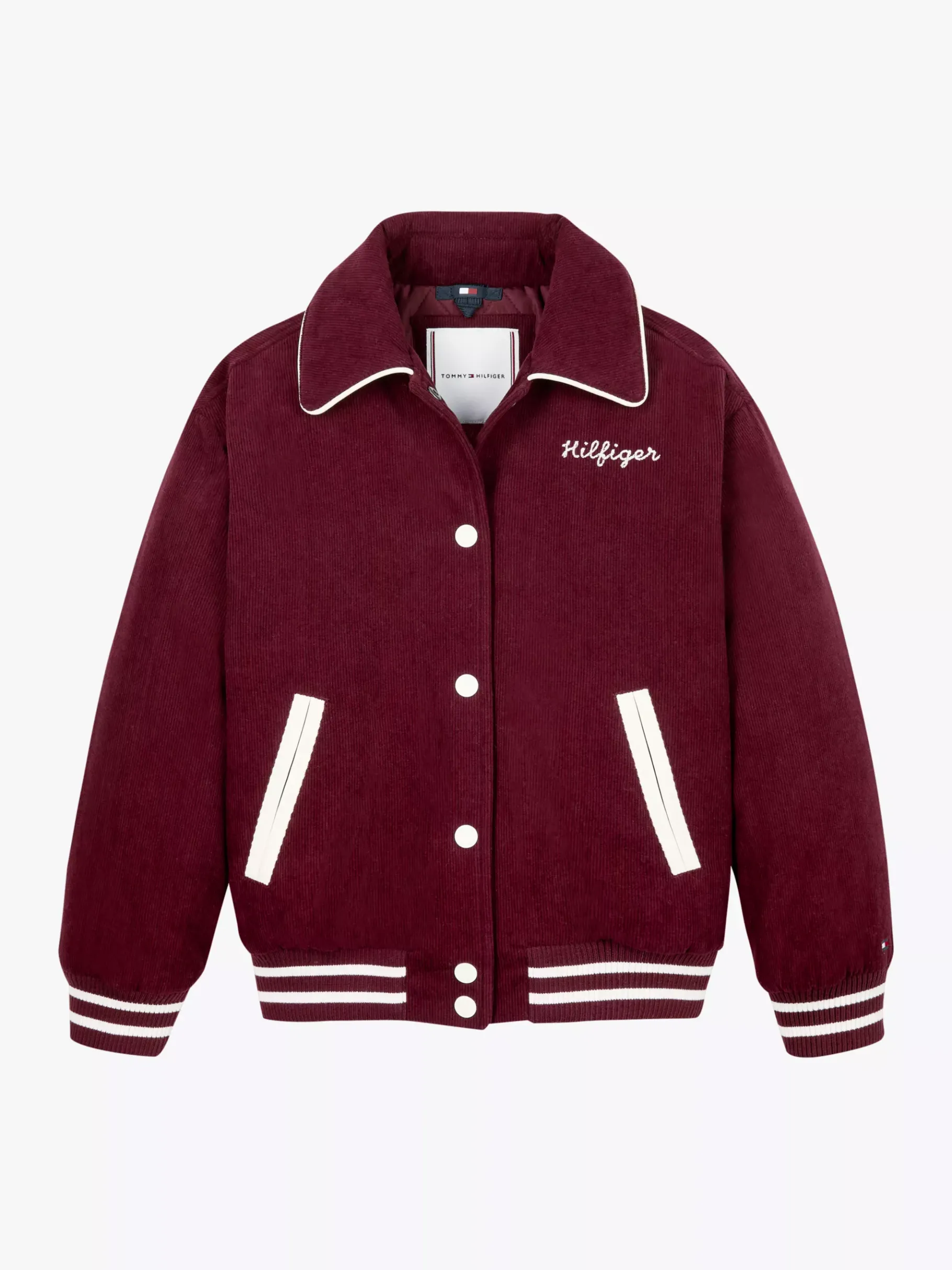 Diese Bomberjacke im College-Stil punktet mit samtigem Cord, coolen Kontrast-Details und Campus-Vibes.