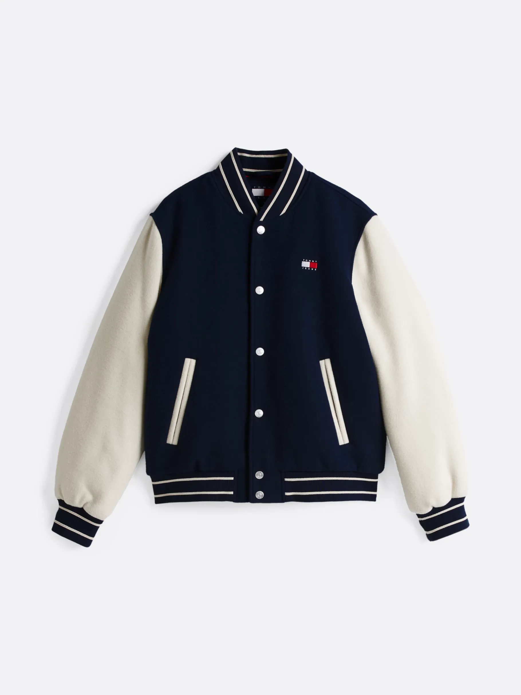 Wolle verleiht dieser Jacke eine raffinierte Struktur, während Kontrast-Ärmel und -Bündchen für klassischen College-Stil sorgen.