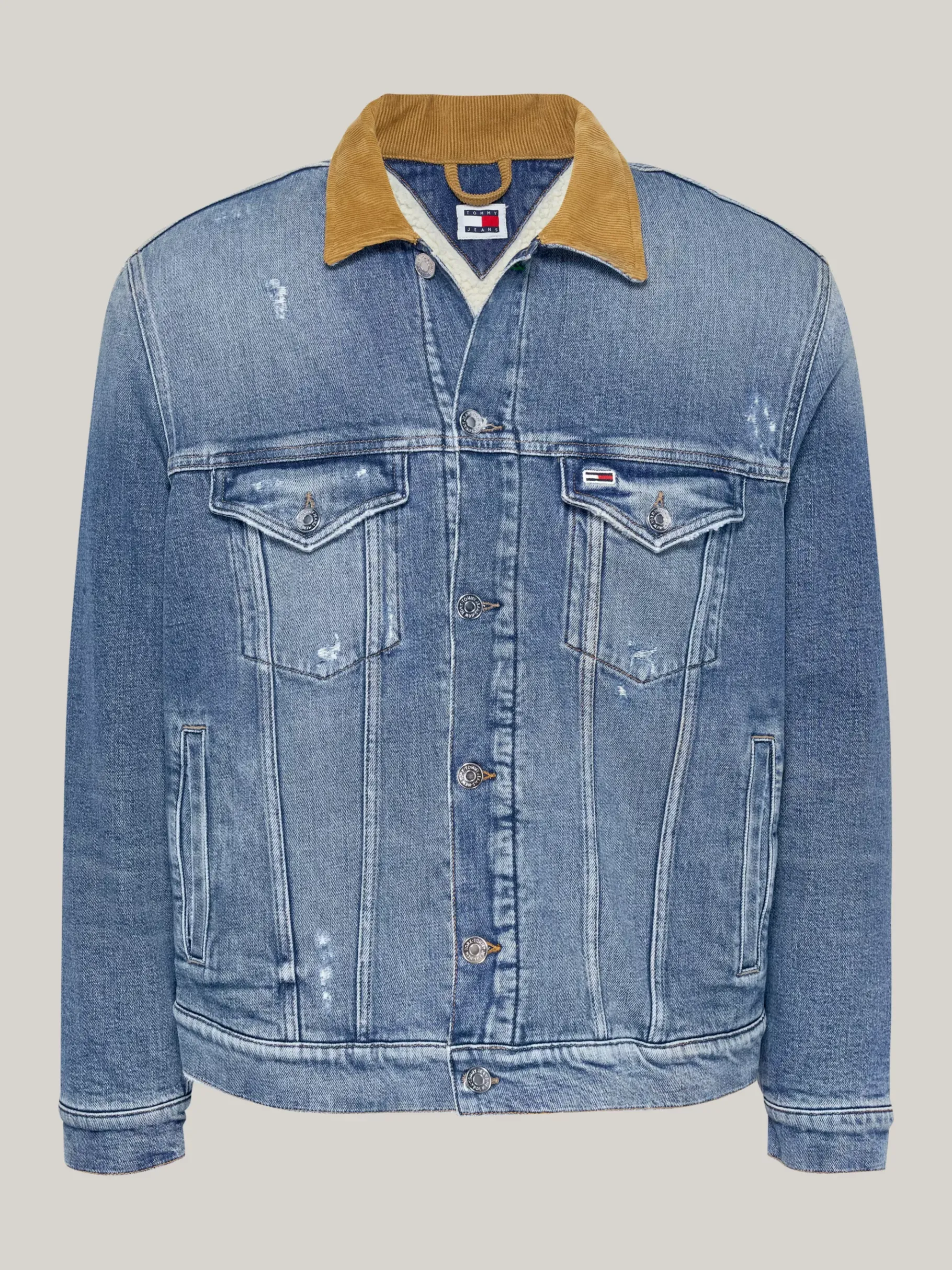 Bring deine Looks aufs nächste Level dank dieser Truckerjacke aus Denim mit Cord-Kragen und urbanen Details im Used Look.