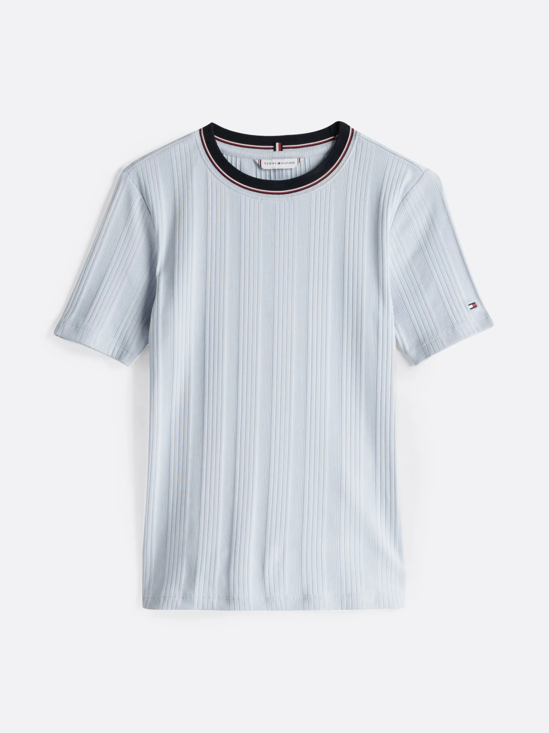 Dieses Rippstrick-T-Shirt im Retro-Stil punktet mit figurbetontem Slim Fit und Tommy-Detail am Ausschnitt.