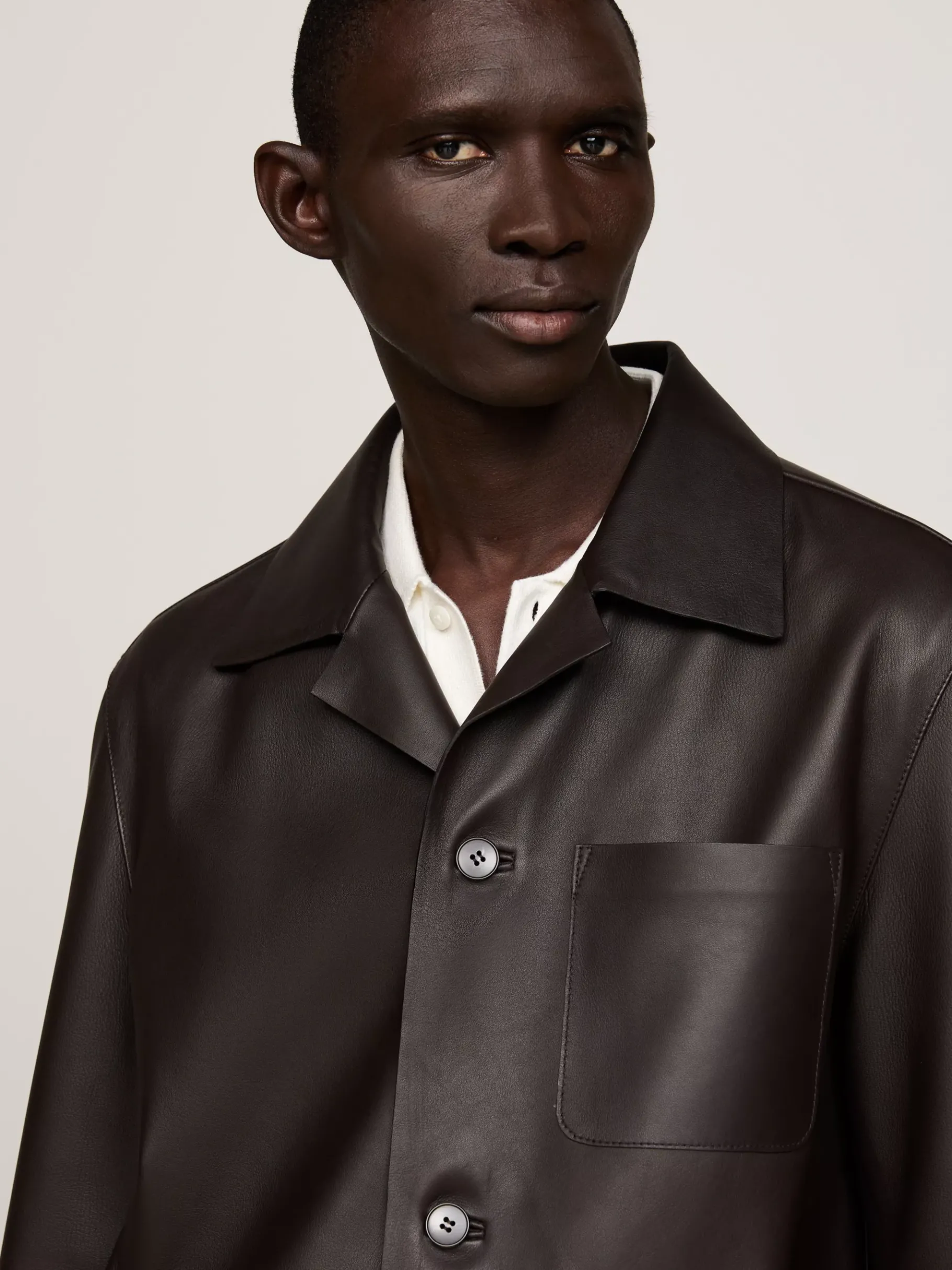 Eine Silhouette im Overshirt-Style sorgt bei dieser Jacke aus Nappaleder mit Knöpfen für smarte, aktuelle Vibes.