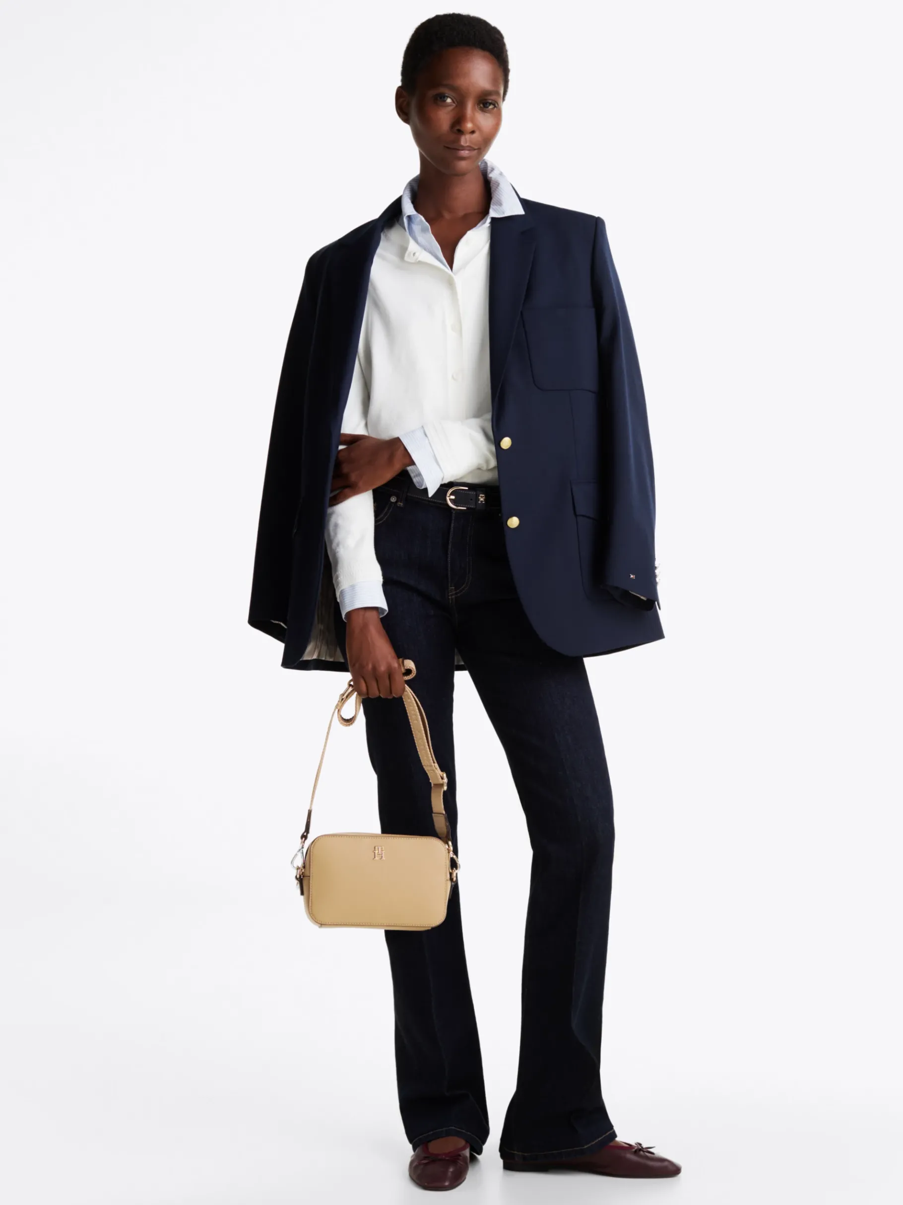 Das glänzende TH-Monogramm-Emblem verleiht dieser vielseitigen Kameratasche mit hochwertigem Grosgrain-Innenfutter einen besonders edlen Vibe.