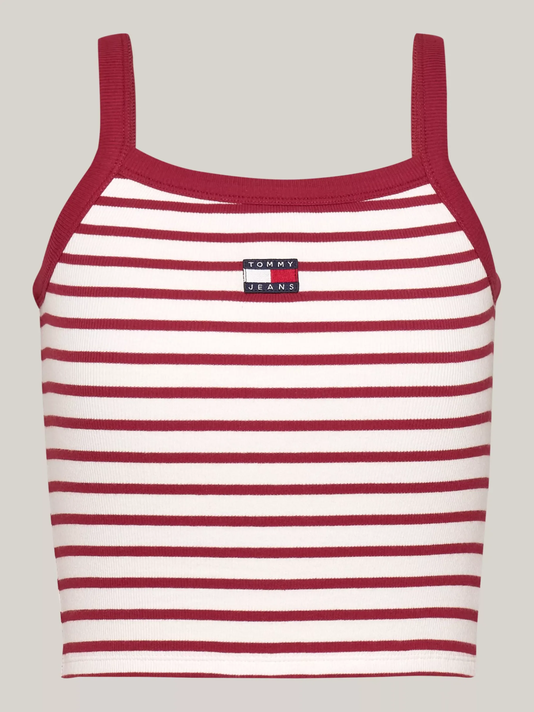 Runde Looks für warme Tage durch dieses gerippte Crop Top mit leuchtendem Tommy-Badge auf der Brust ab.