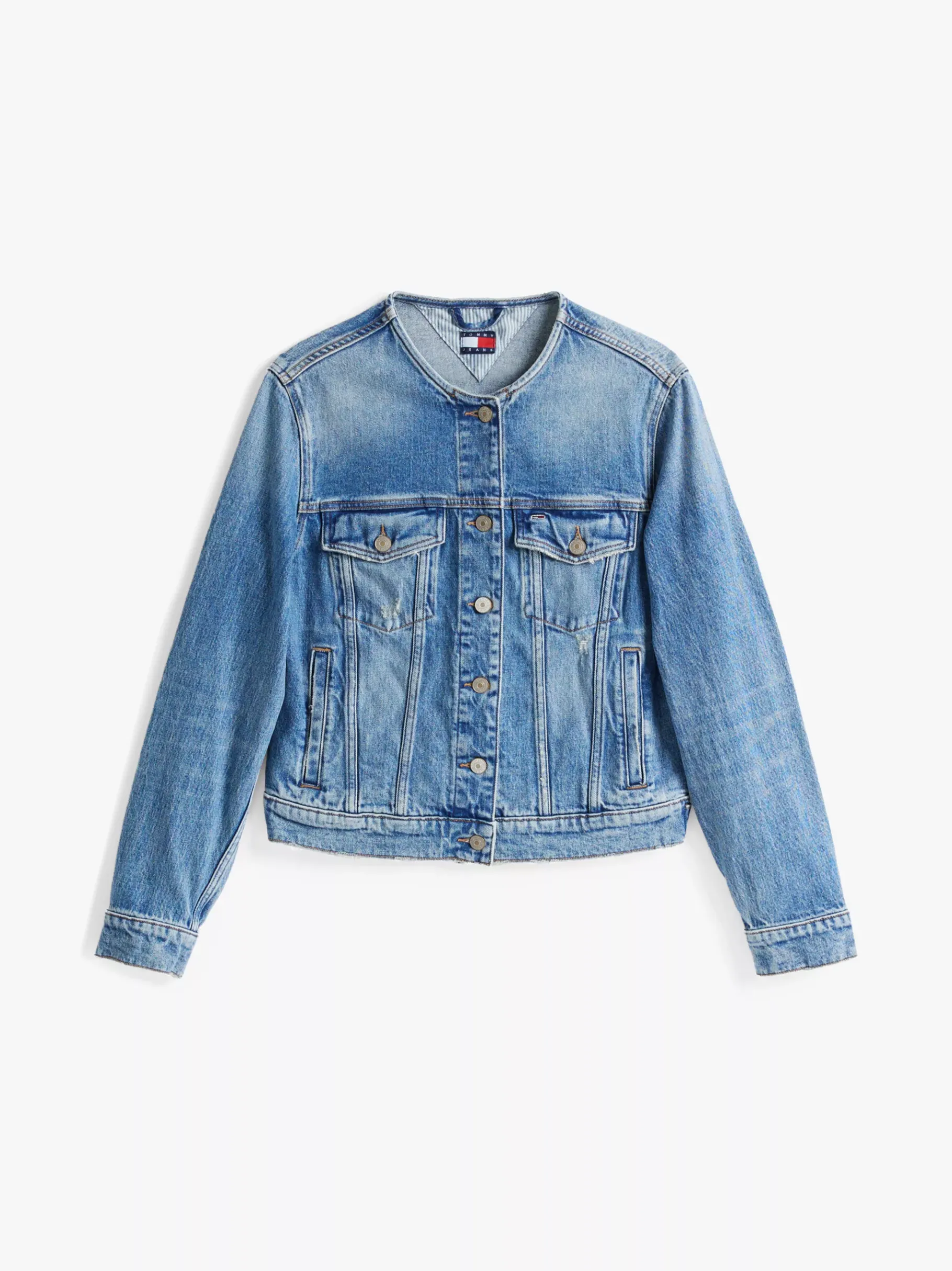 Ergänze deinen Lagen-Look um diese kragenlose Truckerjacke aus bequemem Baumwoll-Denim mit Stretch im College-Stil.