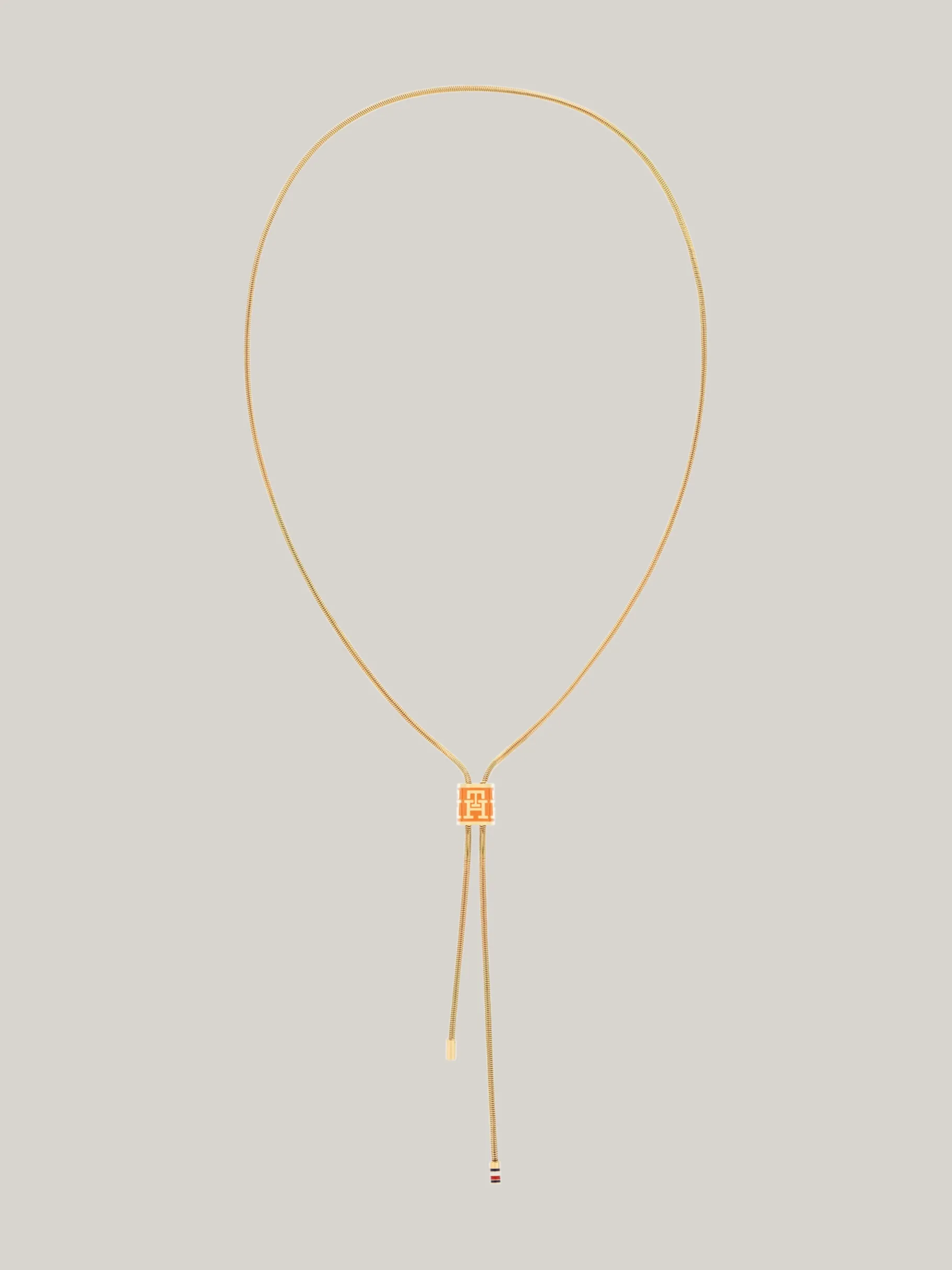 Die langen Enden dieser vergoldeten Halskette kommen aus einem zylindrischen, mit emaillierten TH-Monogrammen verzierten Element hervor.